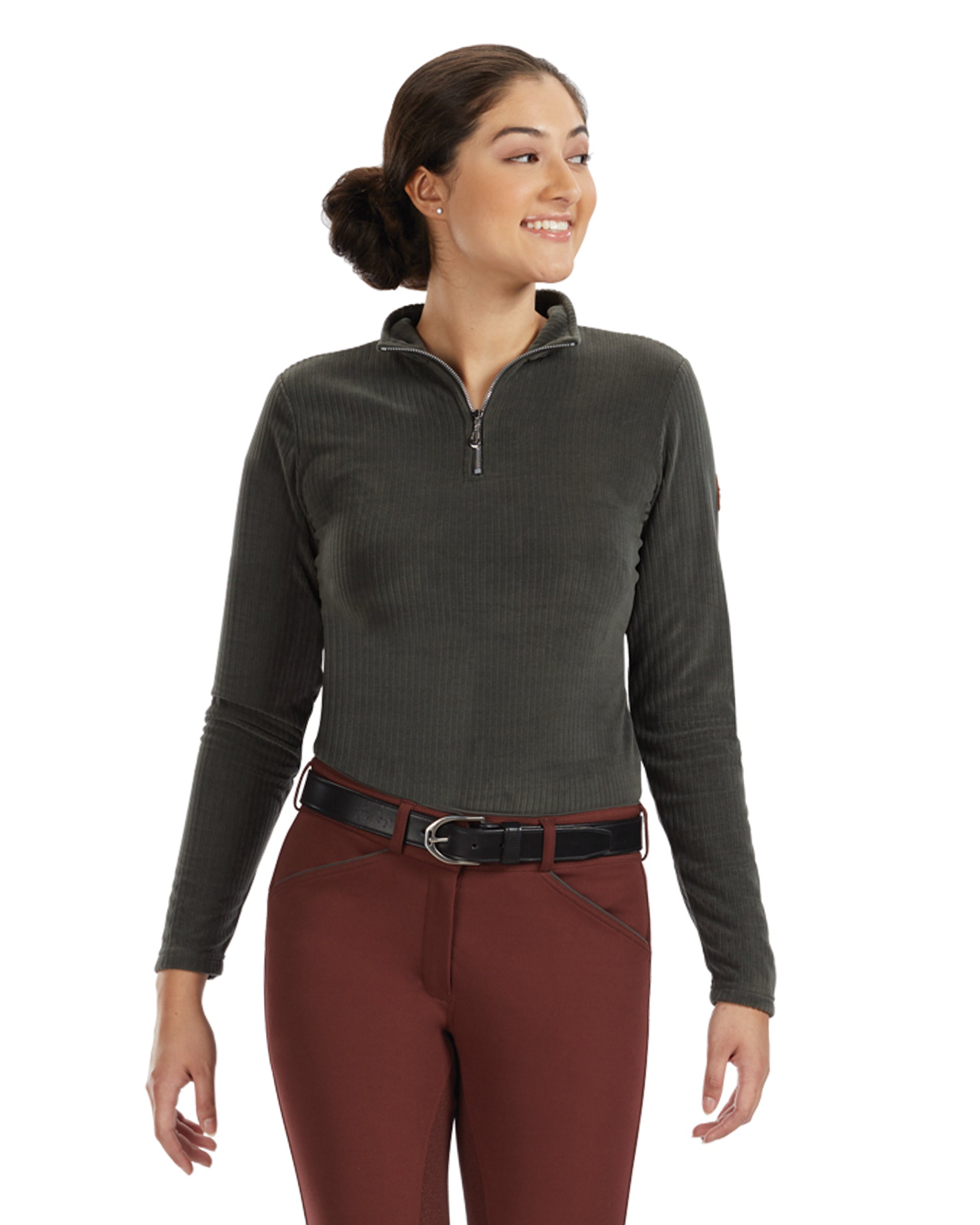 - Quarter-zip placket with ultrasuede trim.