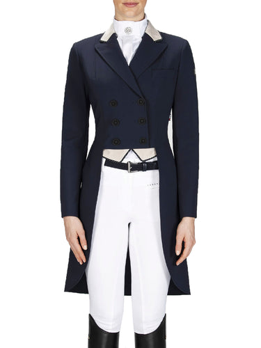 Impeccable construction allows this show coat to offer an ideal fit. A superior choice for any dressage competition, it has sophisticated piping woven with silver thread for sparkle along the collar and points. Embroidery accents the back collar, and the back belt is detailed with two buttons. Tail weights can be removed to ensure optimal comfort for each horse and rider team.