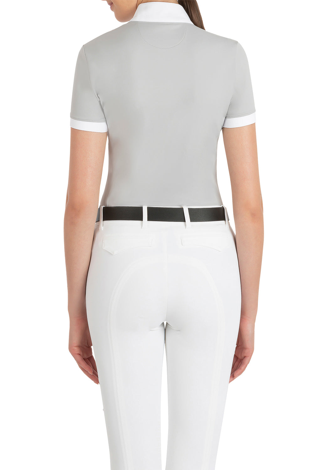 The beautifully appointed Equiline Ladies’ Eulae Short Sleeve Show Shirt has a crisp white poplin collar. Made of soft and breathable stretch jersey, it feels comfortable against your skin and dries quickly. The covered button front placket provides a clean look under any show coat.