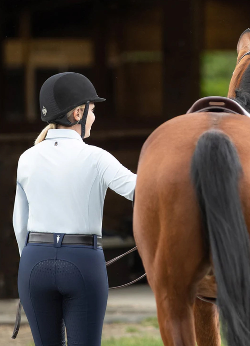 Kerrits® Affinity IceFil® Full-Seat Breech marries exceptional performance and tradition. Mid-weight, stretch-woven fabric with IceFil technology keeps you cool as you sweat. It quickly converts the moisture to a refrigerant on the surface of your skin, with the effect of making you feel up to 5° cooler.