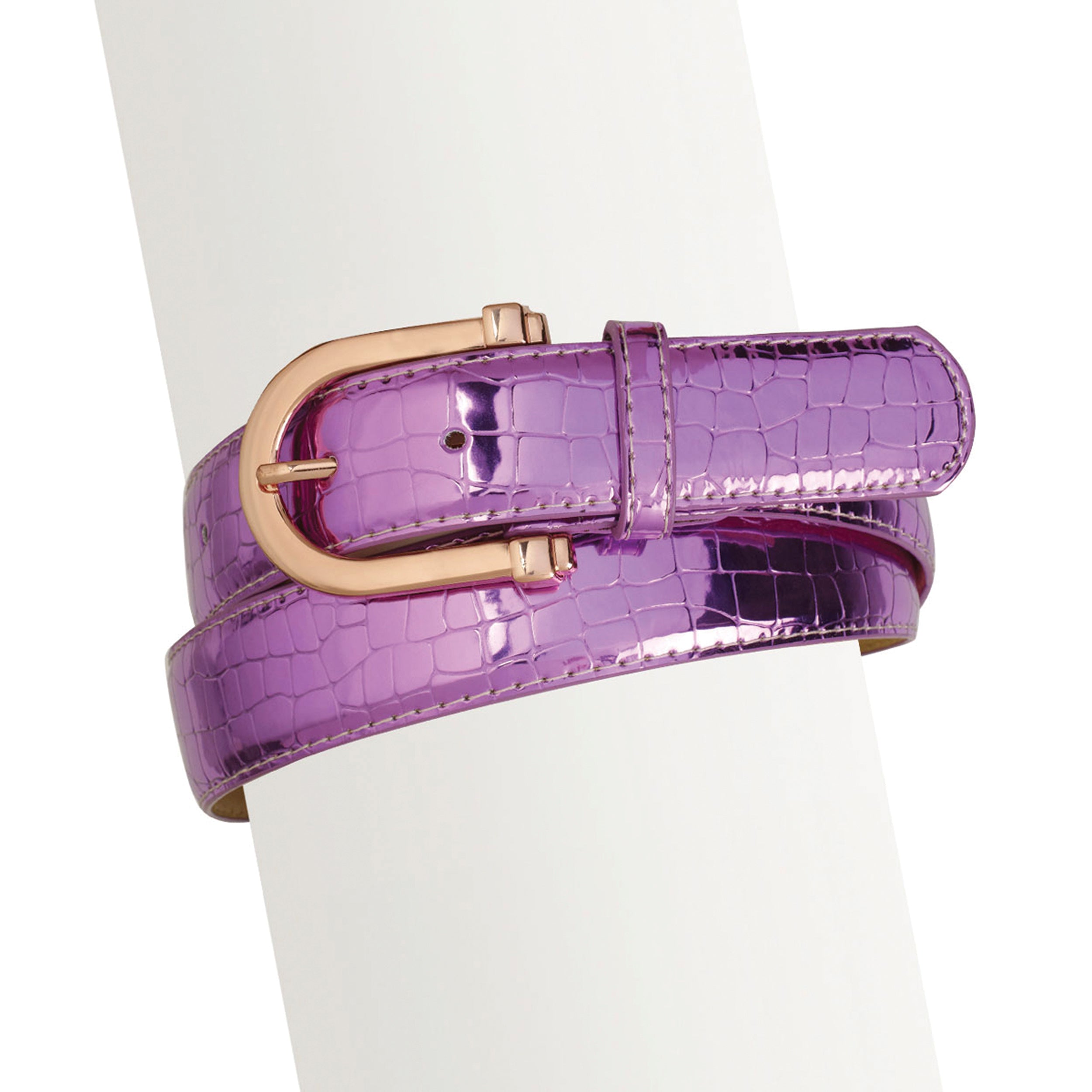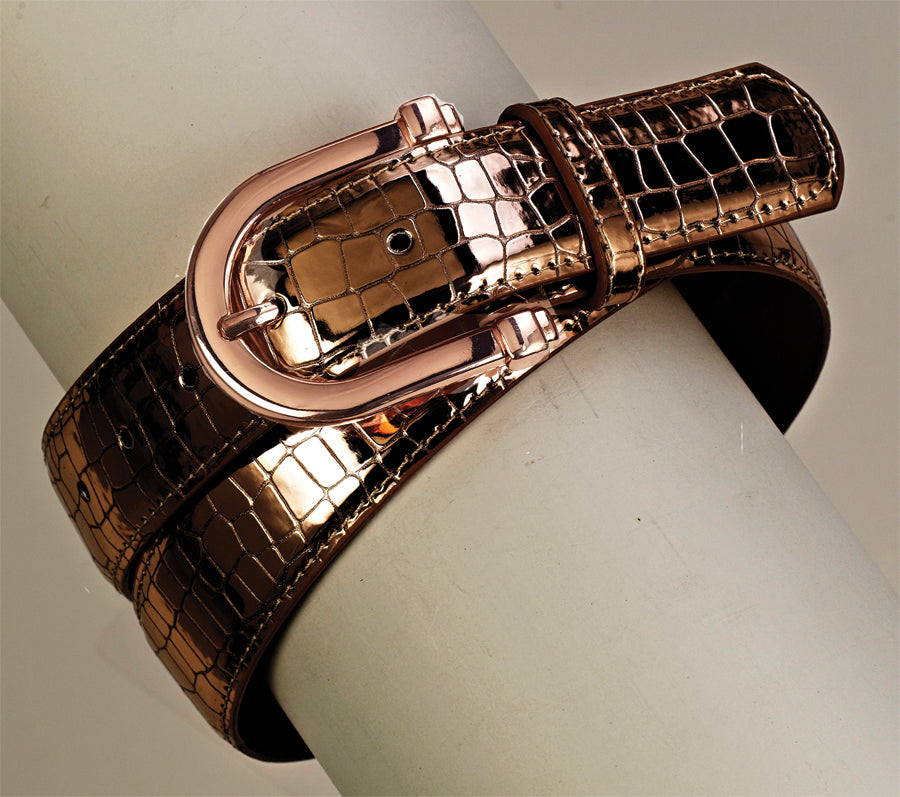 It’s all about the allure of “mixed metals” in this textural Ovation® Metallic Belt. This twist on a classic features a stamped crocodile print on glossy metallic colors, plus an ultra-trendy rose gold colored buckle.