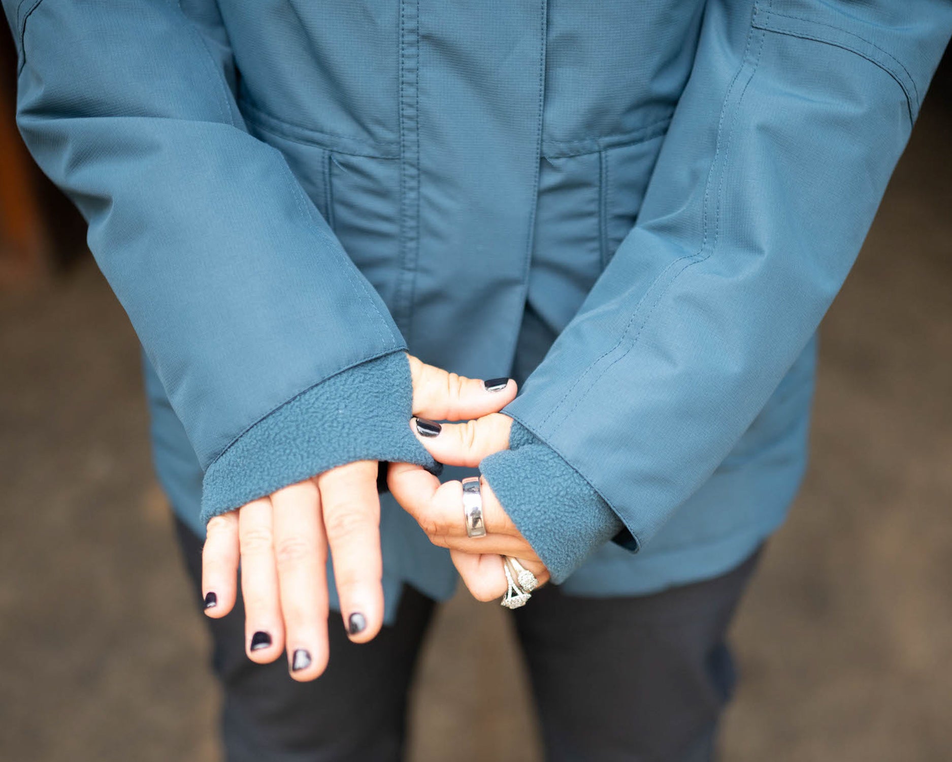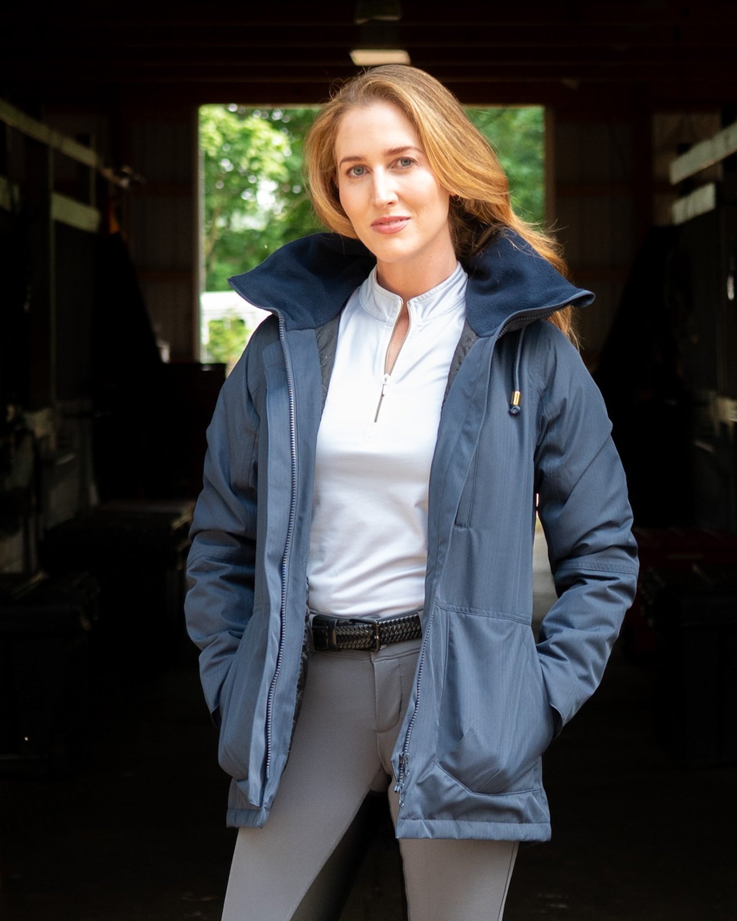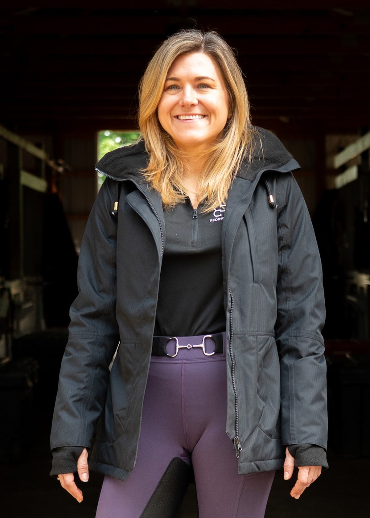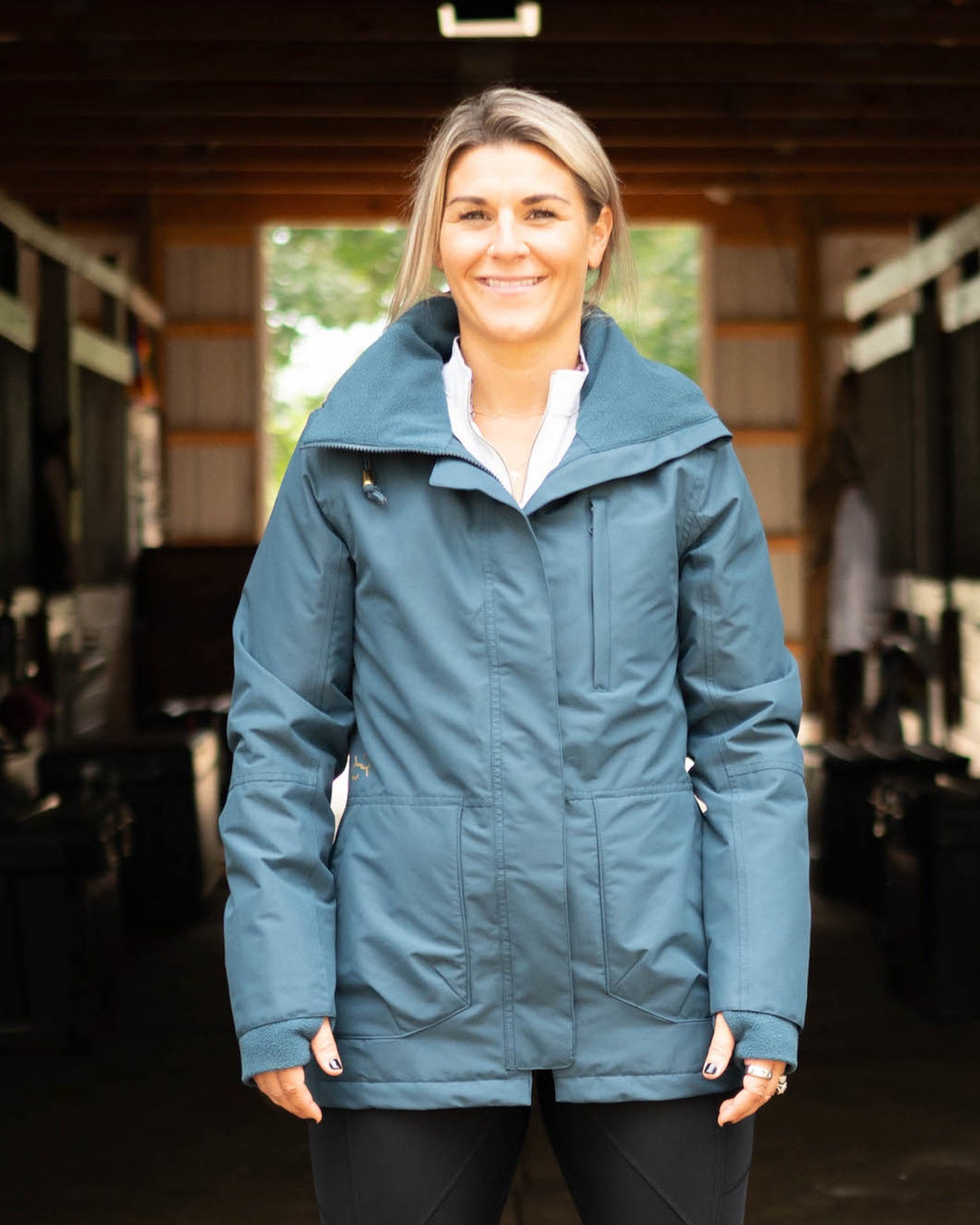 The Redingnote Winter Insulated Jacket 2.0 is ready to take on winter with you! It's lightweight, warm, durable and stylish. Breathable, waterproof shell with fully taped seams and a quilted lining with 60 grams of insulation. Favorite features include the double ended zipper that allows for hip mobility in the tack and fleece cuffs with thumbholes to keep sleeves in place and hands warm. High fleece funnel collar provides additional warmth and protection from the elements. Double-ended front zipper for adjustable fit and mobility. Oversized, adjustable hood fits over a riding helmet. Helmet visor flap flips backward and secures with a magnet to convert to a standard sized hood. Storm flap secured by magnets blocks wind and water. Secure pockets includes a horse treat pocket. Interior "backpack" straps hold the top up when you want to take the sleeves off, made of a sturdy and soft branded elastic. Sized to layer over a standard riding outfit.