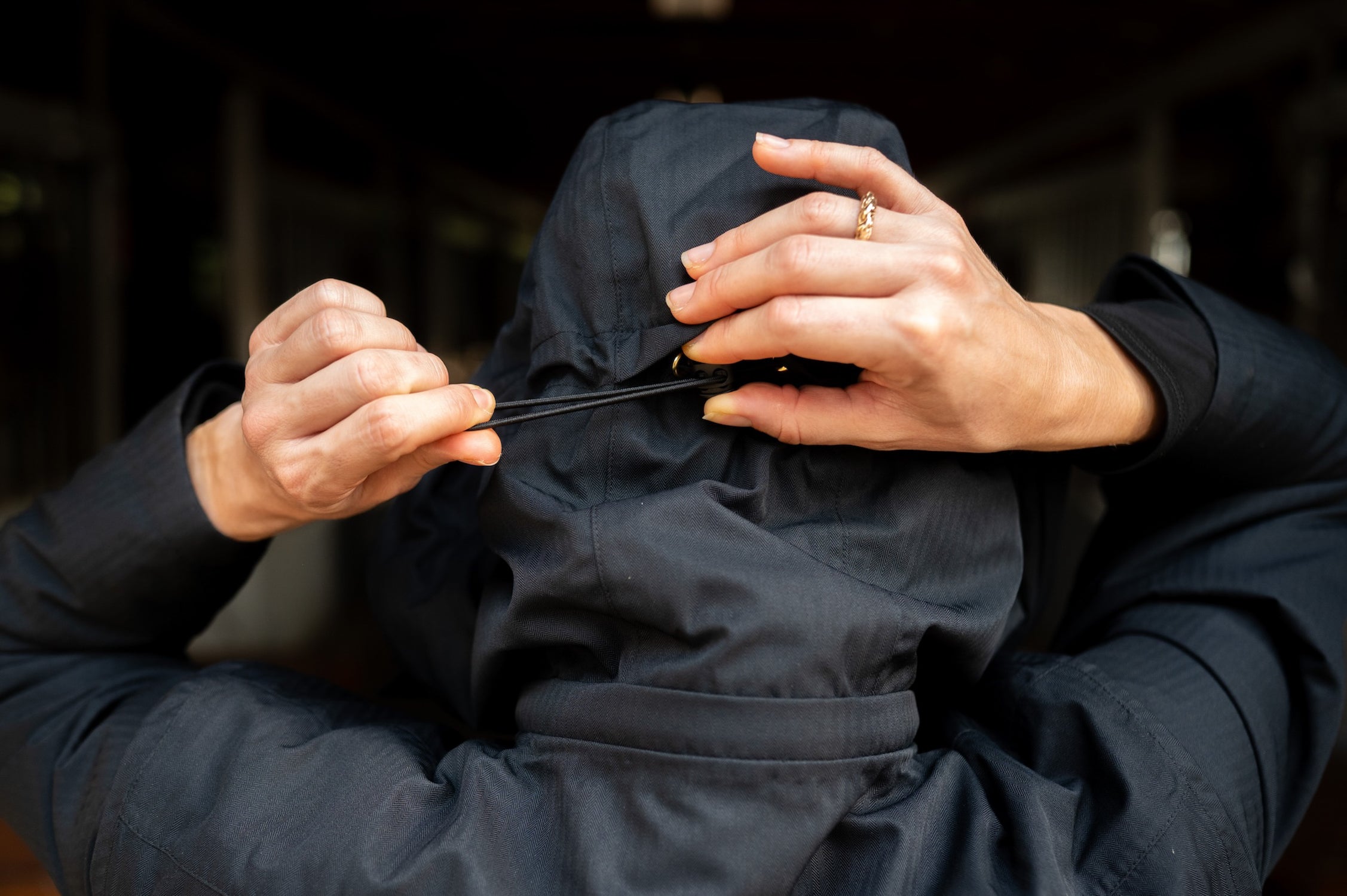 Breathable herringbone waterproof shell with fully taped seams and a quilted lining with 60 grams of insulation. Double storm flap secured by magnets blocks wind and water and armpit zips allow for adjusted air flow. Oversized zip-off hood with three points of elastic adjustment for a secure fit. Hood visor flips backward and secures with a magnet to convert to a standard sized hood. Secure pockets, including a new pocket on the thigh that fits a phone and an D-ring on hip holds your spurs and other essentials when not in use. Elastic cinch insert at back waist adds style and provides freedom of movement. For extra versatility, the unique interior "backpack" straps are designed in soft elastic with the logo to hold the top up when you want to wear it in a sleeve-down position. Layer it over your riding clothes to stay warm, dry, and ready for anything from barn chores to winter rides. Sized to layer over a standard riding outfit.