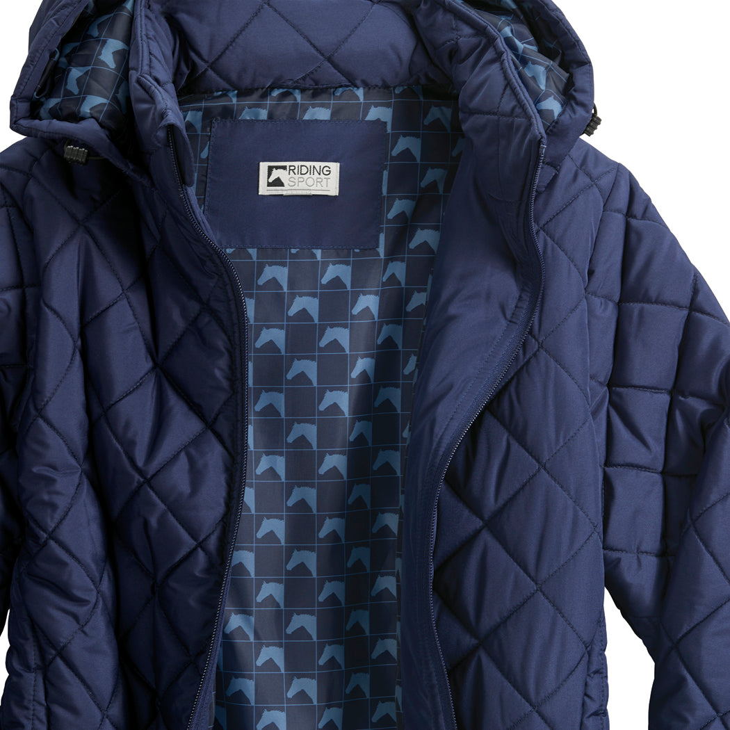 Keep cozy at the barn in this Riding Sport™ Bethany Jacket. With 160 grams of poly fill for mid-weight warmth, it pairs a diamond-quilted, water-resistant outer and a smooth, logo-print lining. Two-way front zip allows in-saddle adjustability. Hood snaps on and off easily.