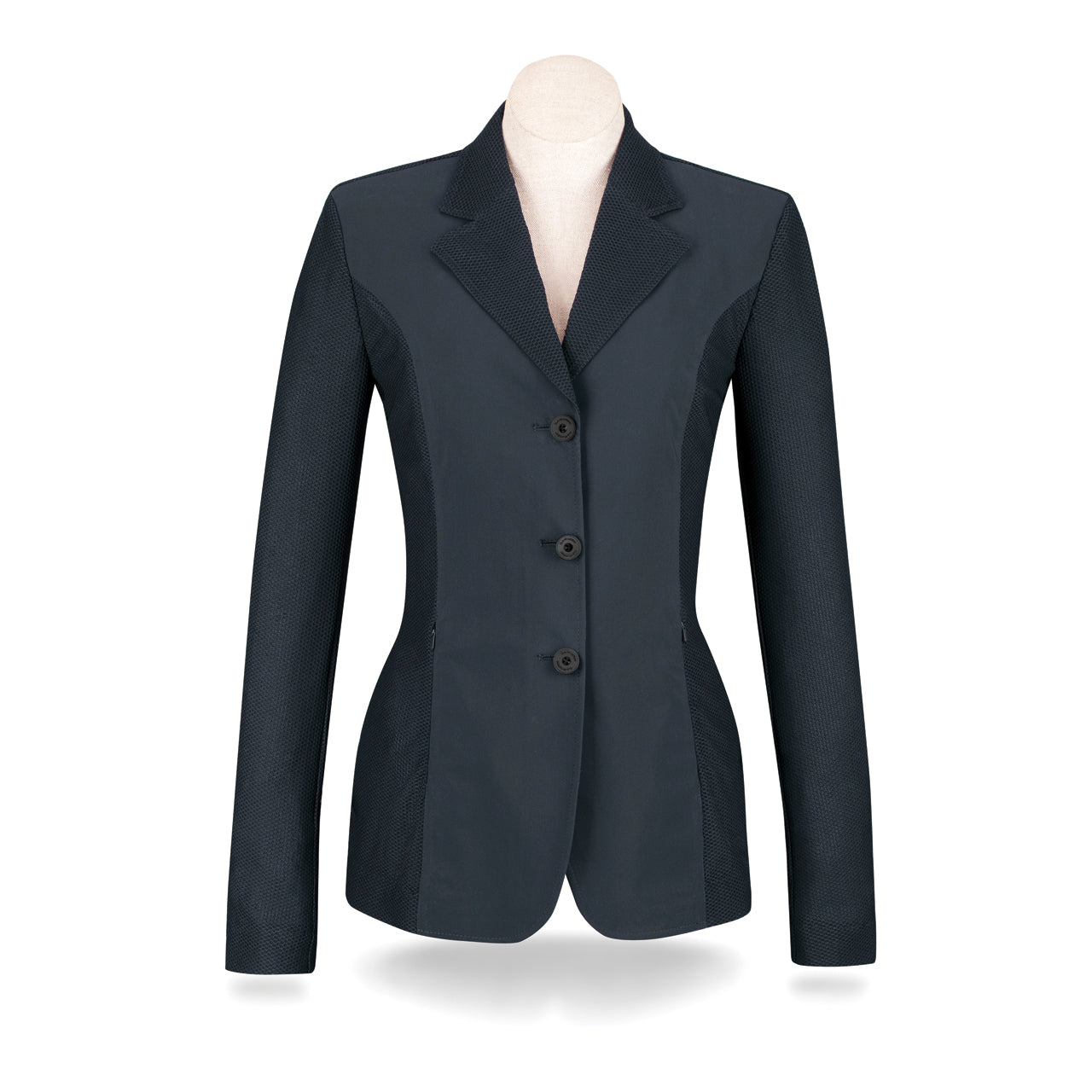 The R.J. Classics Ladies’ Harmony Mesh Show Coat is an elevated, athletic garment that also maintains the tradition of the sport. The lightweight mesh body fabric provides extreme comfort and breathability while the Italian Jersey front panel offers a conservative contrast. Front buttons conceal a zipper which closes for a smooth, gap-free look. Unique back seams provide a subtle twist, while the vertical zipper pockets with locking pulls and matte logo buttons complete the look.