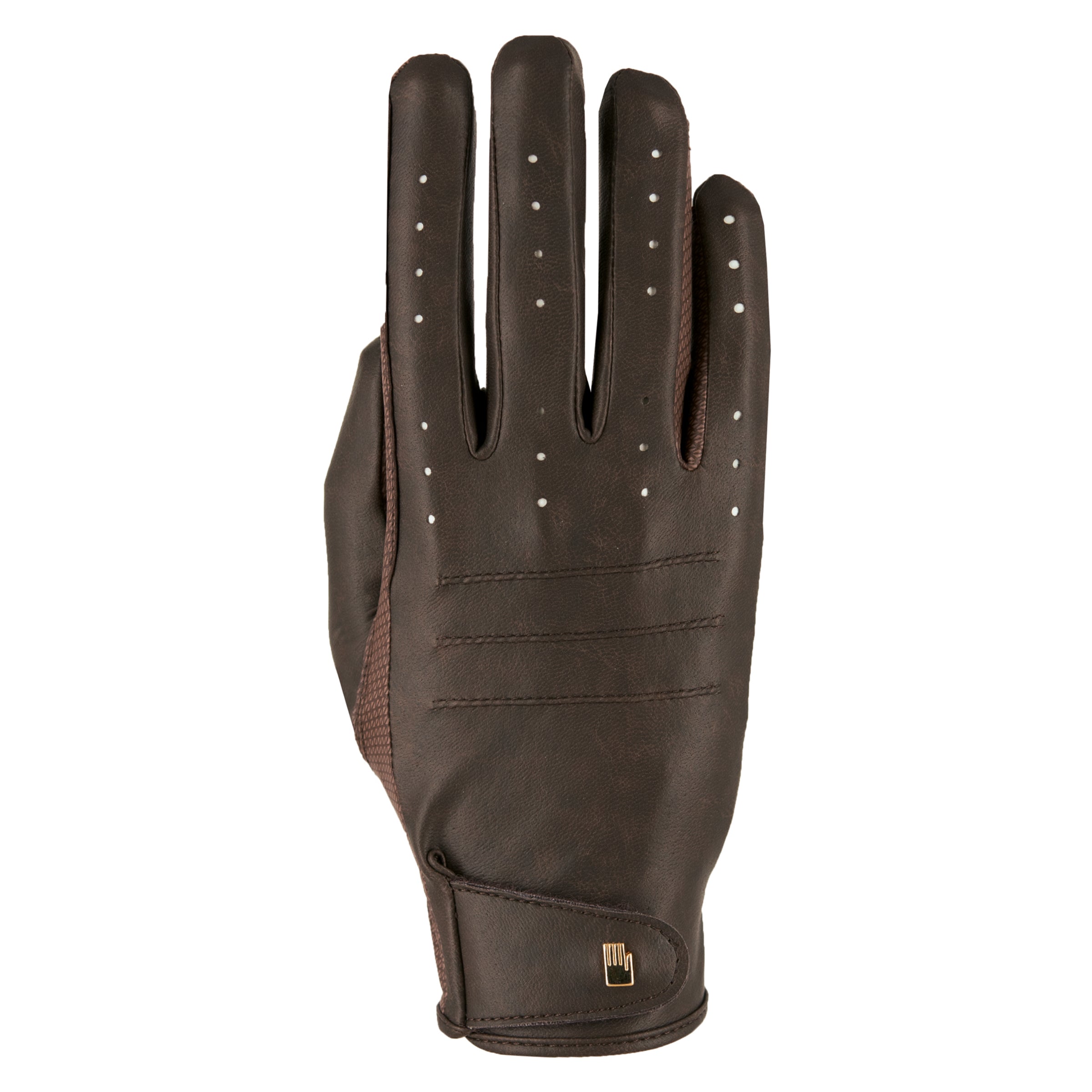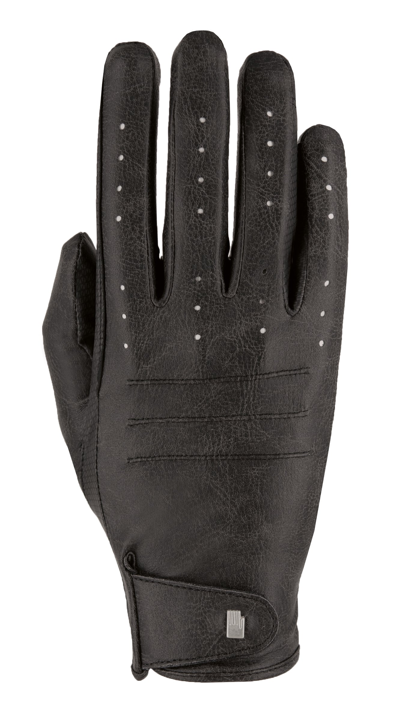 Perforations on the fingers optimize breathability. The palm is made from Roeck-Air, a breathable and supple material that provides excellent feel of the reins. The glove secures with a slim, easy closure on top of the wrist and is complemented by the Roeckl hand logo rivet which creates a stylish highlight. Pair.