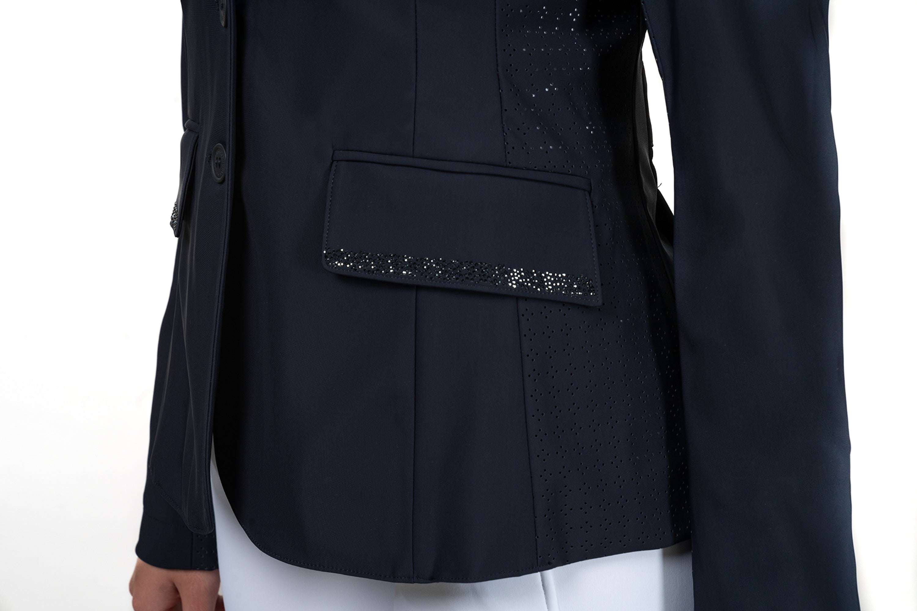 Fashionable, functional and ready to perform, the competition jacket has been elevated with the Schockemöhle Ladies’ SpAlaine Show Coat. Piped pockets with flaps and rhinestone decoration for a flattering look in the saddle, perforated side panels with dividing seams and back bar at the back. Walking slits, rhinestone decoration on the collar and back bar. Buttons and a concealed zipper close the jacket with a clean silhouette. Logo rubber badge on the sleeve announces Schockemöhle sophistication.