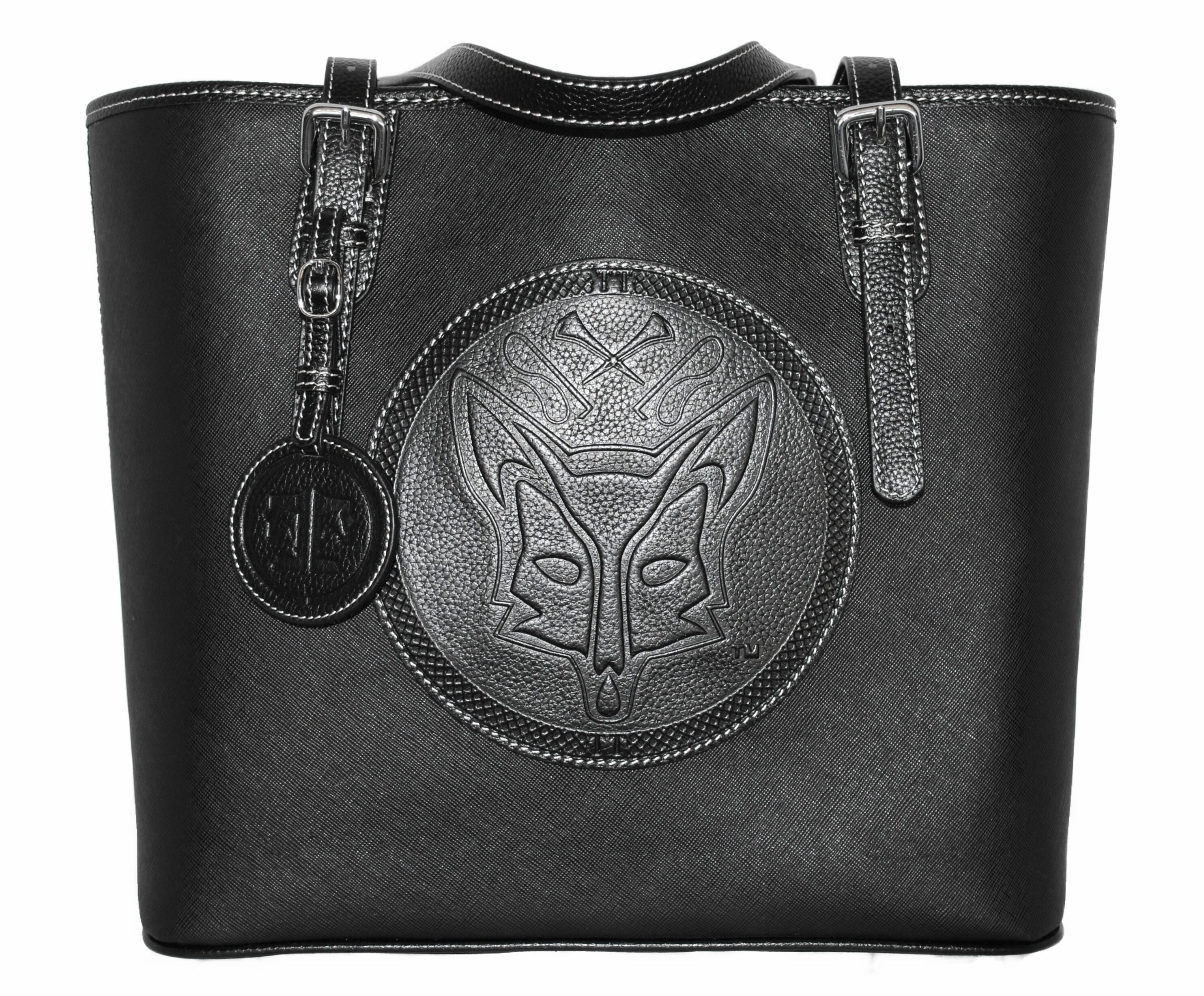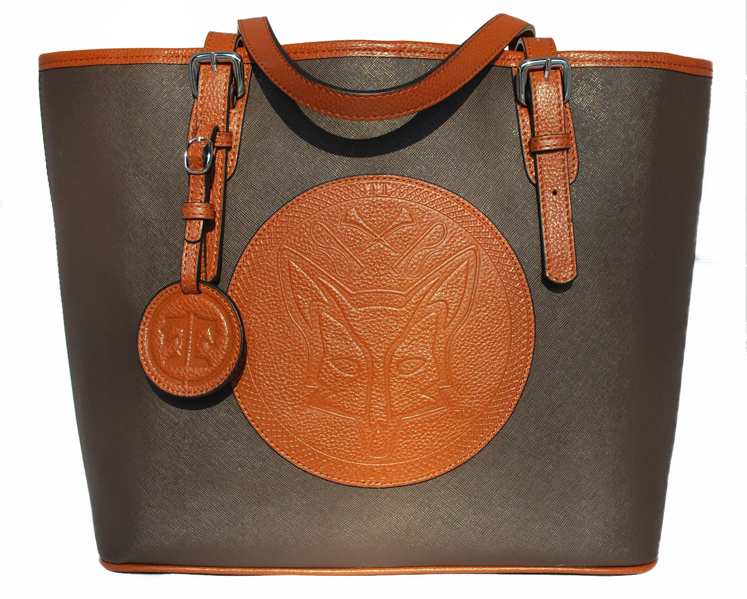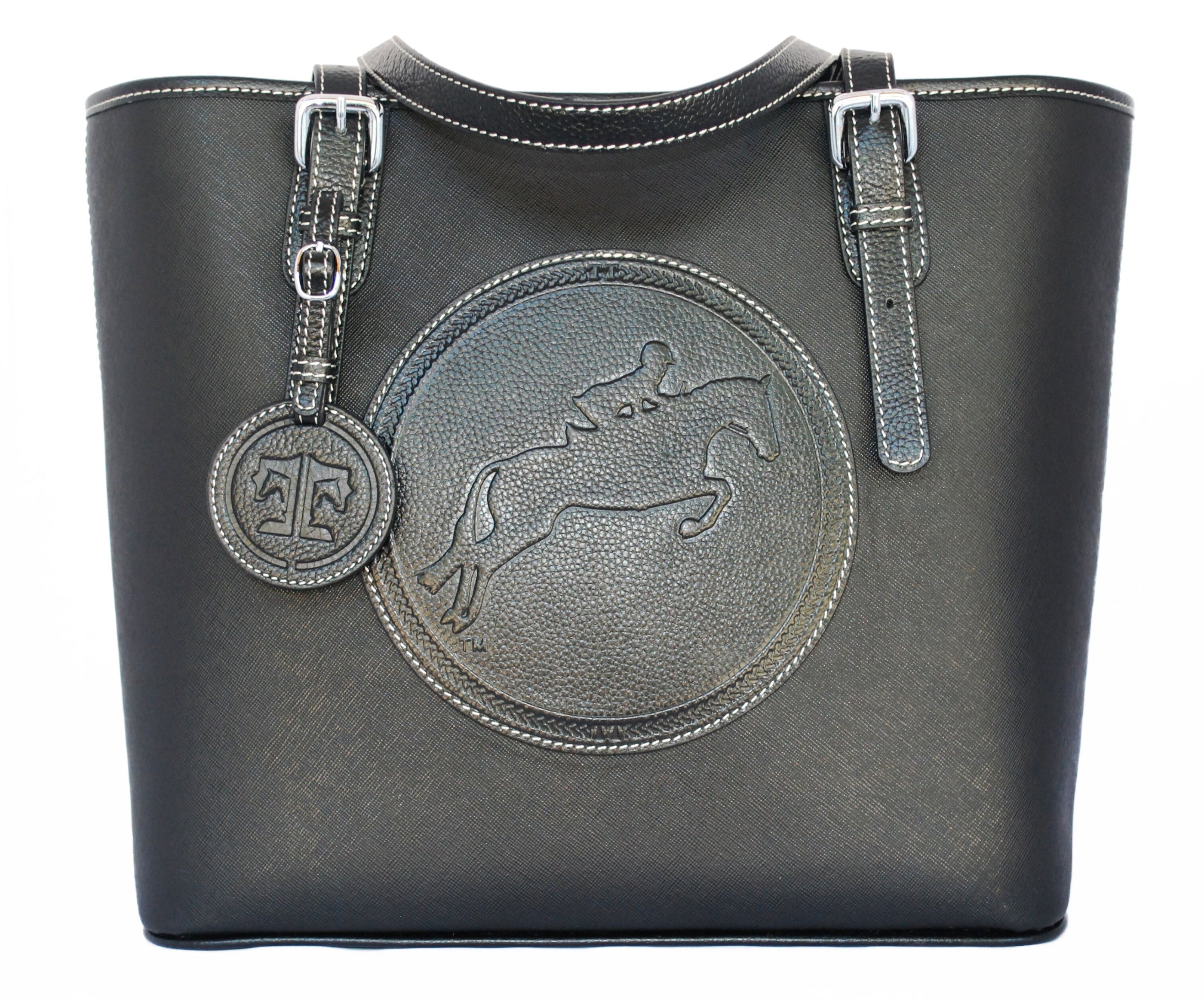 The James River Carry All is the most versatile and durable creation yet from Tucker Tweed Equestrian™. This generous tote with scratch-resistant saffiano leather exterior stands firm on carrying daily essentials to the barn, shows or for days at the office. The roomy woven scarlet-lined interior has pockets for smartphone and key fob, a large zippered pocket for extra security and a tablet compartment with snap closure and embossed leather logo. Complete with silvertone hardware and feet, this handbag is embossed with a hunter/jumper motif in pebble-grain leather of a contrasting color. Features include a silvertone lobster-clasp closure, oil rubbed edges, silver buckle accents and double handles with adjustable 7-11" drop. Includes cream satin logo dust cover.