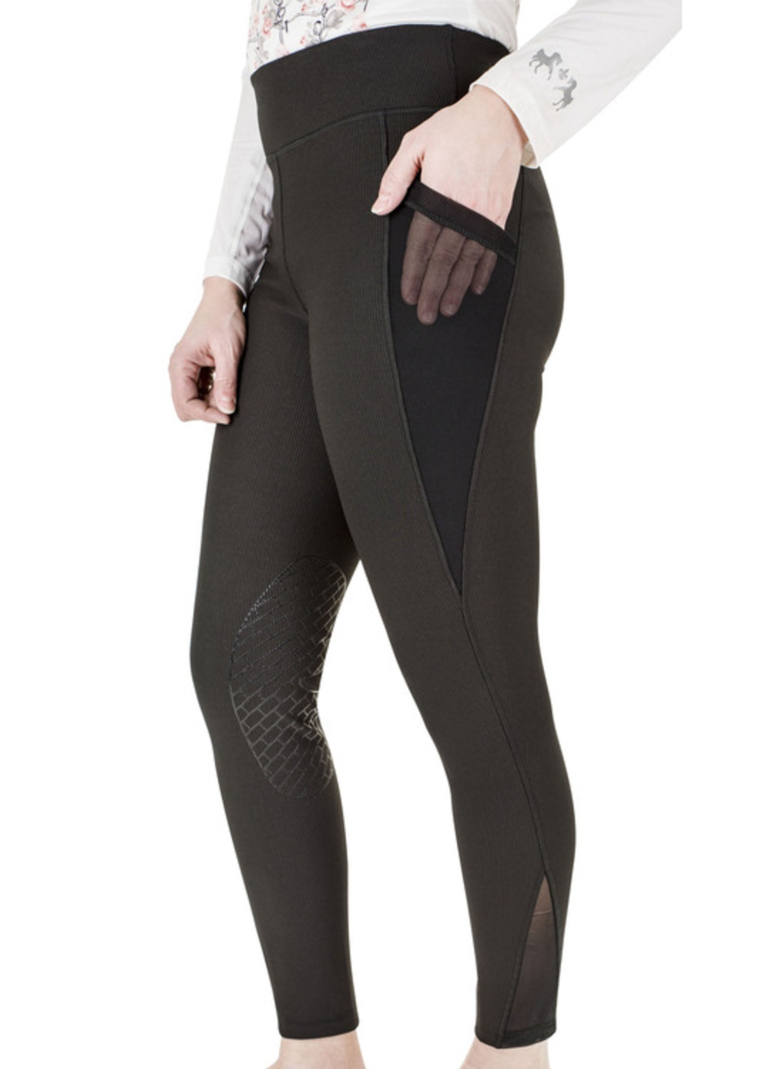 The TuffRider® Ladies’ Classic Ribbed Knee-Patch Tight combines the traditional look of a ribbed bree h with the comfort of a pair of leggings. The wide, pull-on waistband has a slimming effect for a flattering shape.