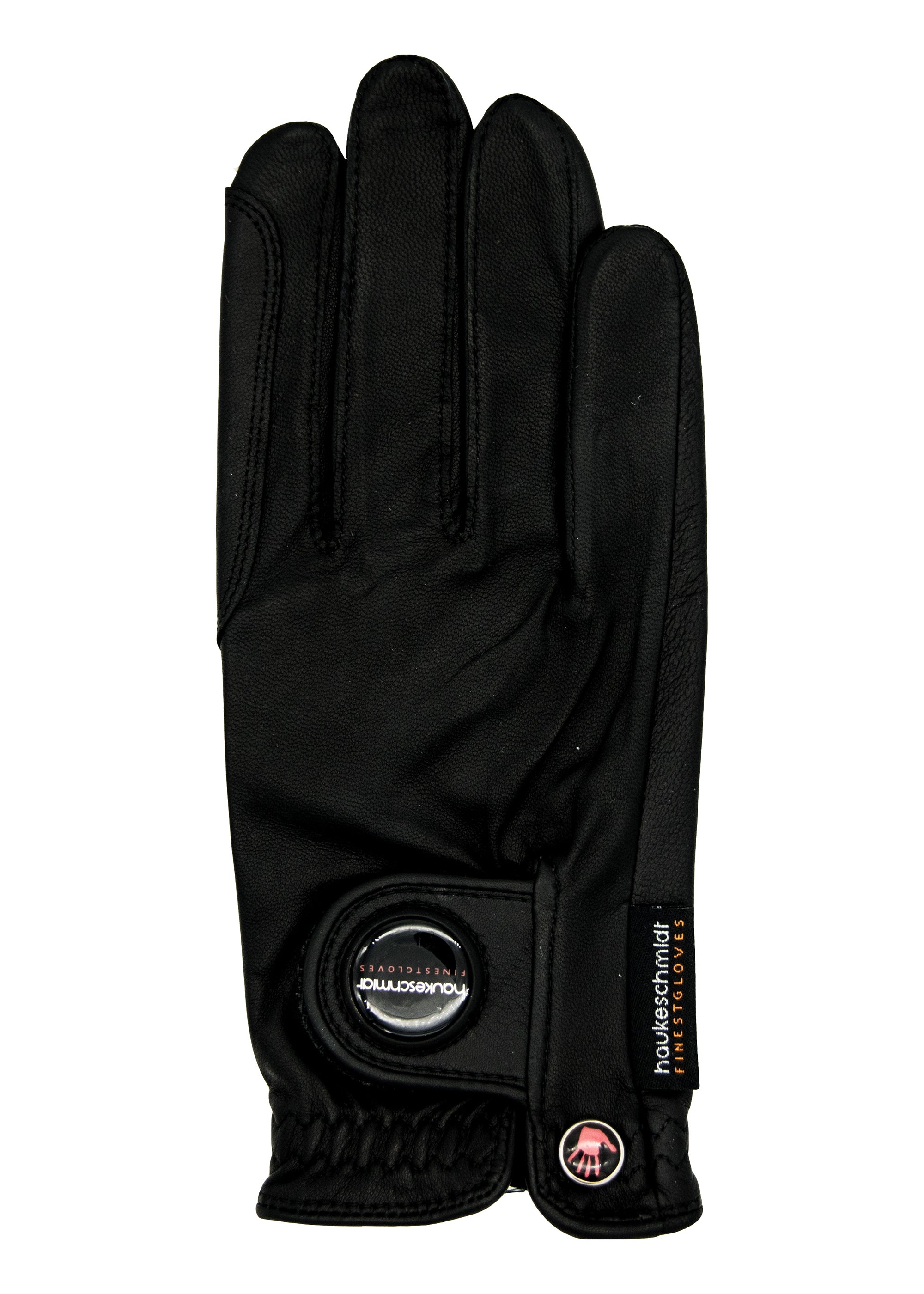 This riding glove has an elasticized wrist with hook-and-loop backhand closure topped by a Hauke Schmidt logo medallion. Black. Pair.
