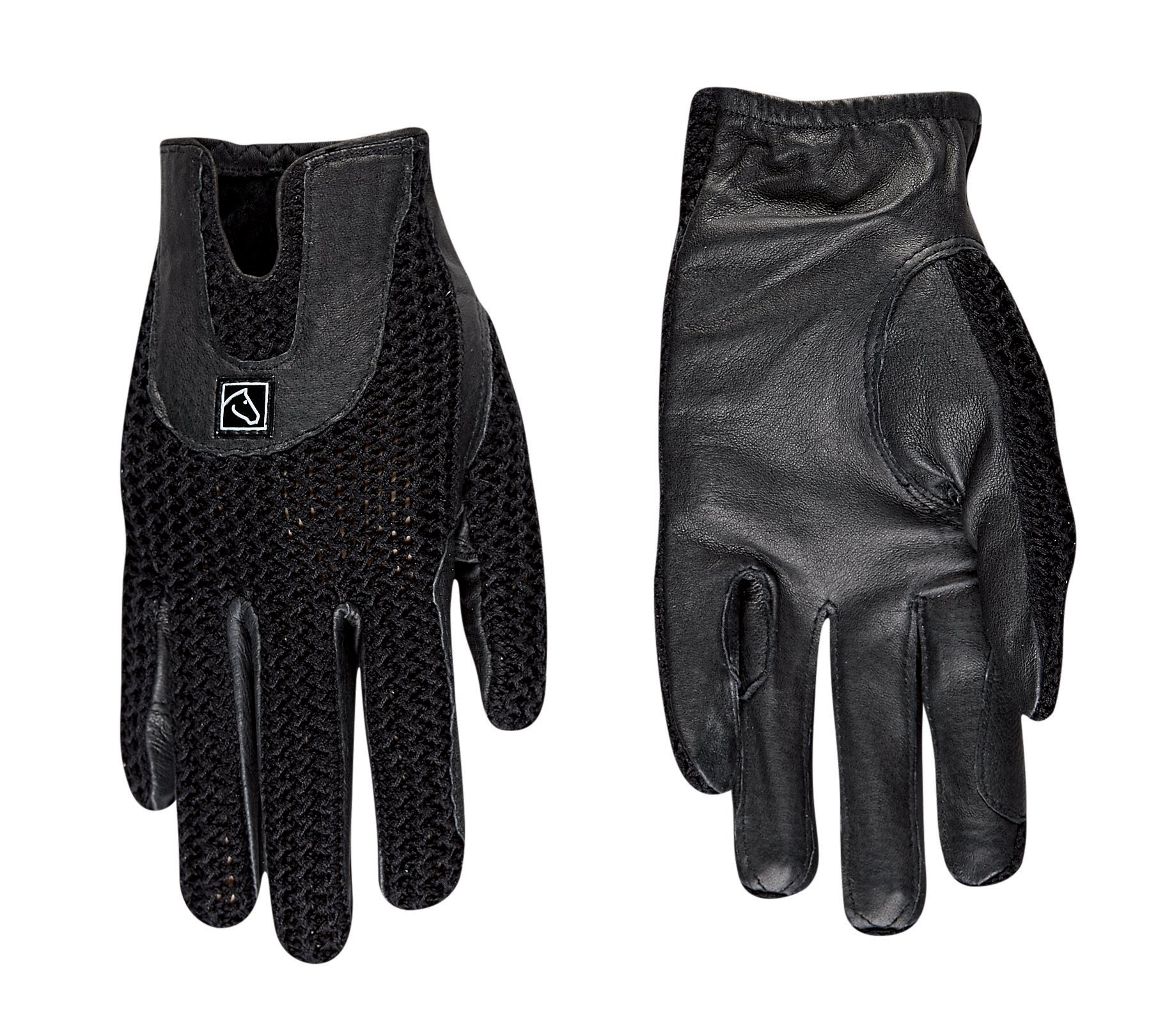 The SSG® Lycrochet Horseshoe Back Glove has a pigskin palm with reinforcements on the fingers in areas of rein contact. The cool crochet back makes it perfect for warm weather riding.