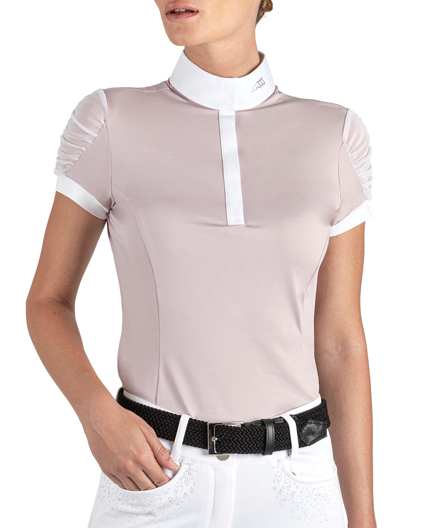 The Equiline GinnyG Competition Shirt is a gorgeous design for your show ensemble. Technical piqué fabric with built-in stretch and breathability has feminine stretch-tulle detail on the sleeves. The Equiline logo completes the collar.