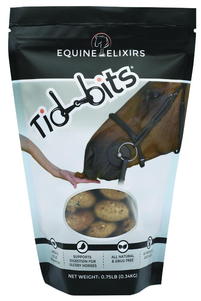 Equine Elixirs Tidbits® Cookies Supporting Digestion are crunchy, tasty treats formulated to help support healthy digestion. Ideal for use during training, competition, travel, weather and environment changes or any stressful situation, Tidbits resist crumbling in your pockets.