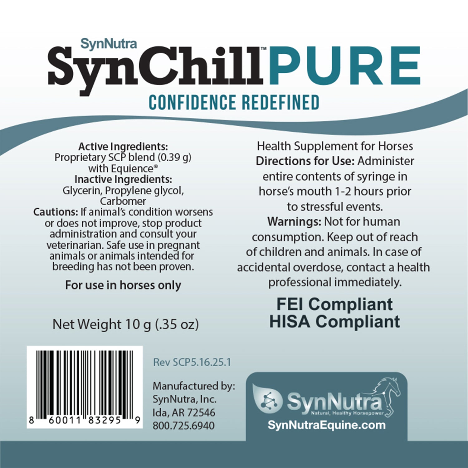 SynNutra Equine® Synchill™ Pure Gel is designed to help manage your horses natural fear responses while maintaining clarity and control. Made with PURE, Equience®—and without L-theanine—SynChill PURE promotes a sense of confidence in your horse without dulling their competitive edge. With SynNutra Equine SynChill Pure, you can help your horse manage the mental demands of competition, training, and travel while maintaining their peak performance.