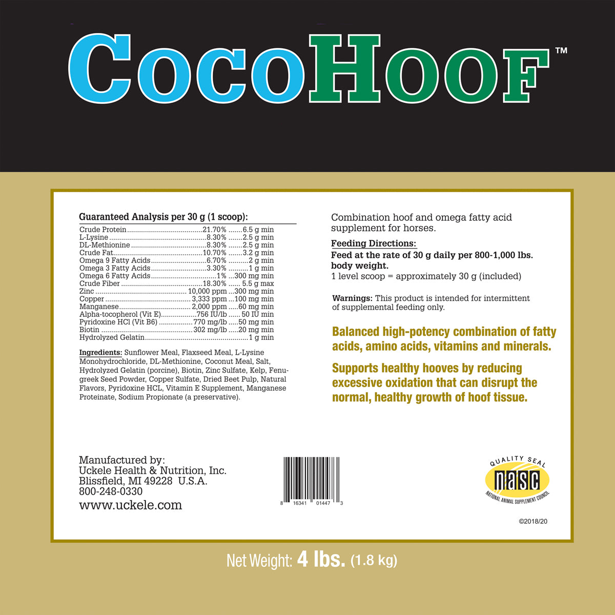 Uckele® by SmartPak® CocoHoof™ Pellets encourage normal hoof growth and give weak, shelly hooves a boost with omega fatty acids, amino acids, and essential vitamins and minerals. Nutrients such as biotin, lysine, methionine, copper, and zinc support strong, tough hooves. Key in the production of keratin, a major protein, these same nutrients are also central to skin and coat health. CocoHoof's well-balanced formula additionally contributes to hoof and skin integrity by reducing excessive oxidation, which can disrupt the production of healthy tissue. High concentrations of amino acids lysine and methionine, plus hydrolyzed collagen, important for connective tissue proteins, hoof growth, and immune defense. Zinc, copper, and manganese, minerals necessary for the proper production of proteins responsible for structural integrity in skin, hair, and hooves. Omega-3, omega-6, and omega-9 fatty acids help maintain pliability and hoof moisture level. Biotin, a vitamin necessary for the health and growth of hoof proteins and other connective tissue, including keratin Pyroxidene, a key B vitamin for protein assembly. Highly palatable base of expellers' (cold pressed) sunflower seed meal, flax meal, and copra meal with fenugreek and natural CocoSoya flavoring. No artificial preservatives.