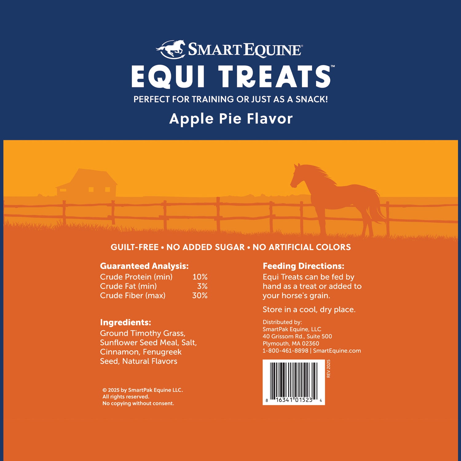 Equi Treats™ Bite Sized Pellets by SmartEquine™ are made with timothy grass, sunflower seed meal, natural flavors, and no added sugar or artificial colors. Equi-Treats are a soy-free, non-GMO alternative to sugary treats that you can feel good about rewarding your horse! Equi-Treats are a useful training tool or just a fun way to bond with your horse. With the timothy and sunflower base, it allows for horses with a sensitivity to alfalfa to be included in enjoying these tasty flavors! These high-fiber and low-fat treats are irresistible while avoiding the unnecessary added sugars found in many treats, making them the great choice for all horses. Timothy and sunflower meal high-fiber treats Irresistibly tasty flavors. Safe for even EMS and Cushing's horses with less than 10% ESC and starch.