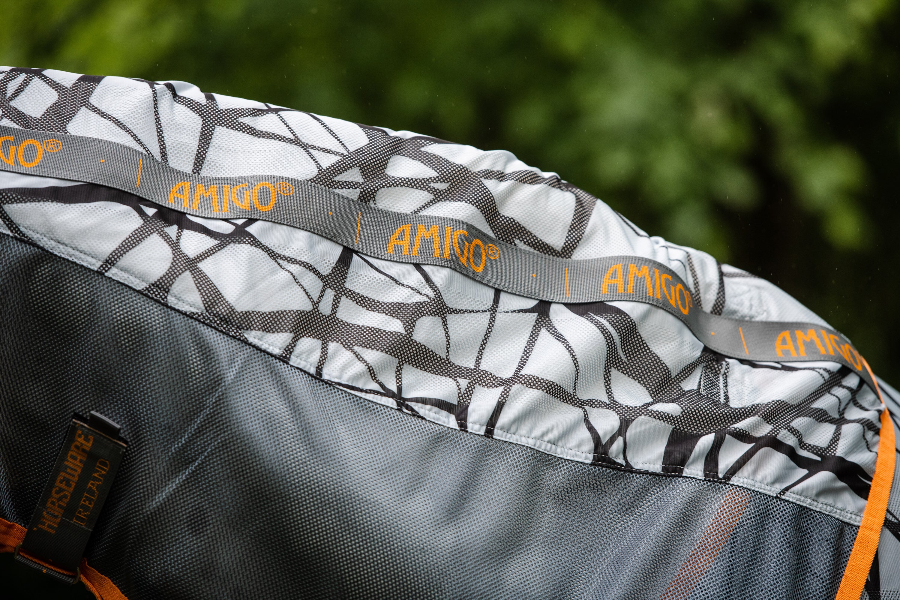 The Amigo® Camo Fly Sheet with removable neck cover by Horseware® Ireland features a fly-deterrent print inspired by the wings of the fly. The monochromatic pattern helps prevent flies from landing on your horse’s body. Layered black lines on a gray background create an optical illusion in the eye of a fly. It breaks up the shape of the horse, so insects struggle to identify it as a target.