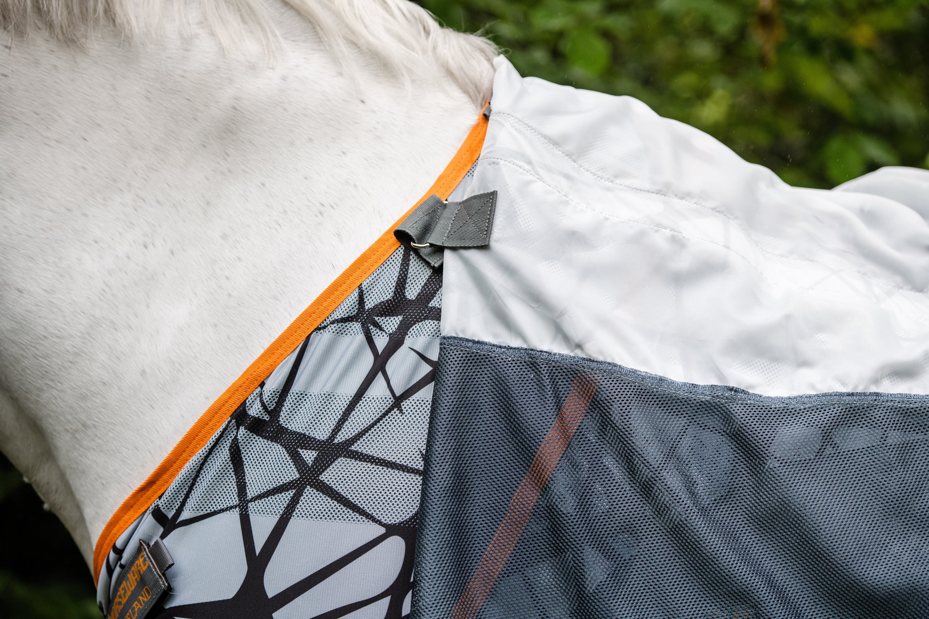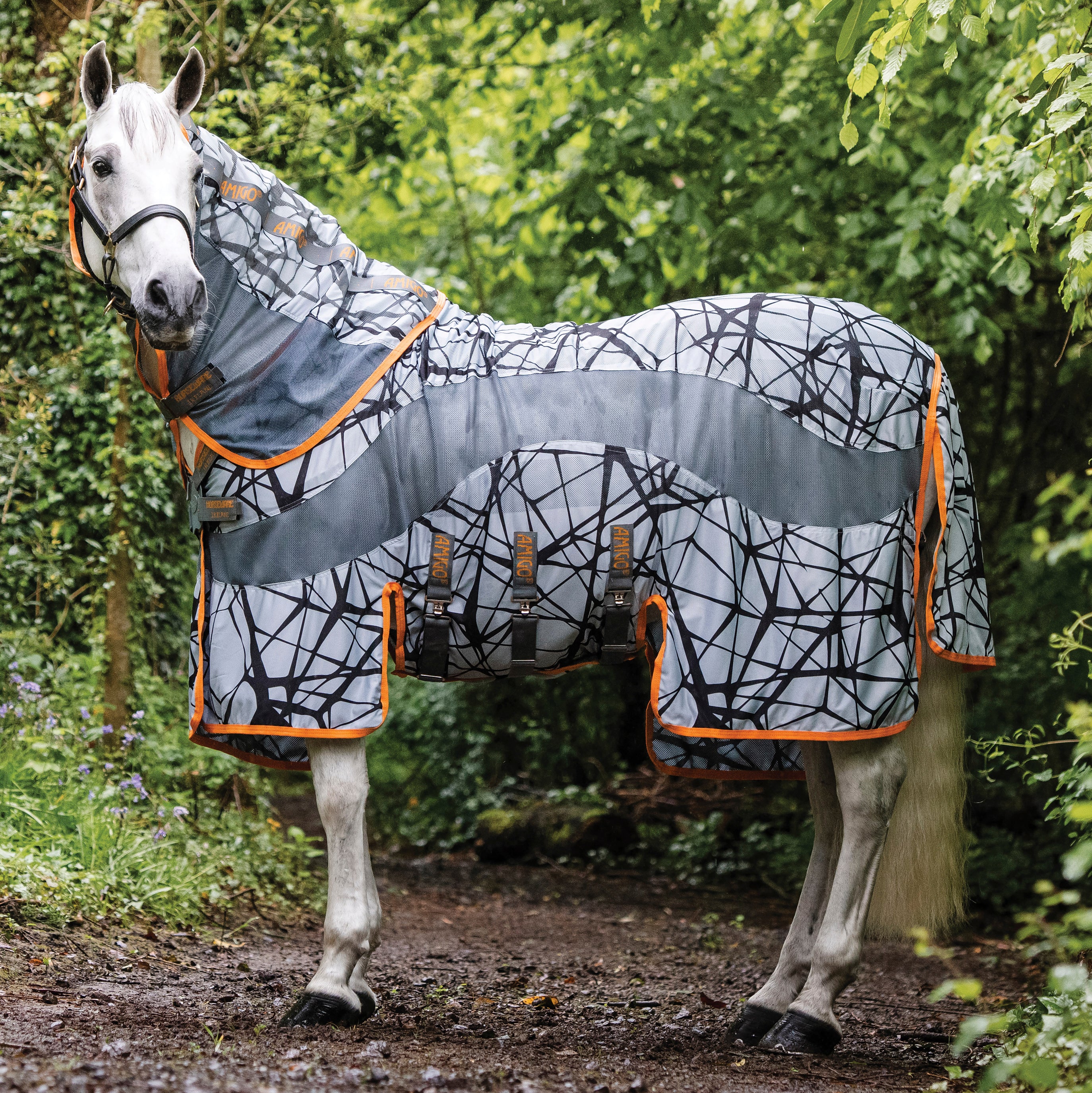 The print is applied to lightweight knitted poly net offering both breathability and sun-reflective properties. A shine-enhancing lining at the shoulders, mane and tail flap protect hair.