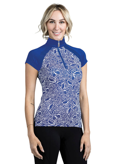 Kastel Denmark Melanie Cap Sleeve Blue Leaves Shirt features a contemporary foliage print in seasonless royal blue and white. Royal blue collar, short sleeves and back yoke add sporty flair.