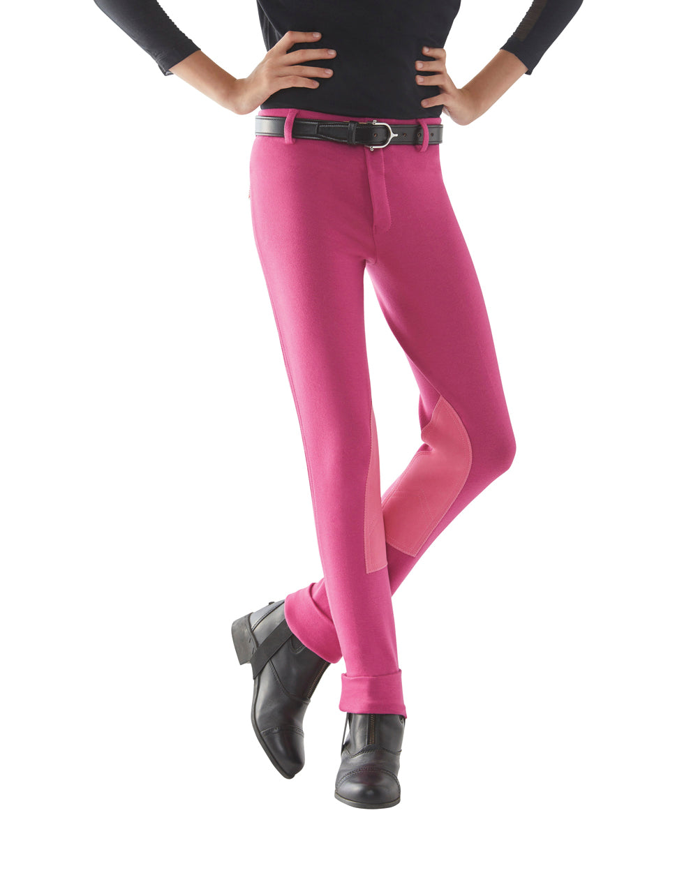 Perfect for little riders, EquiStar™ Children's Pull-On Jods combine pull-on styling with an exceptional price. These kids' jodhpurs are made of comfortable, mid-weight fabric with regular rise, belt loops, Grip Star™ suede knee patches and cuff bottoms. Ideal for lessons and schooling. Available in fun colors!