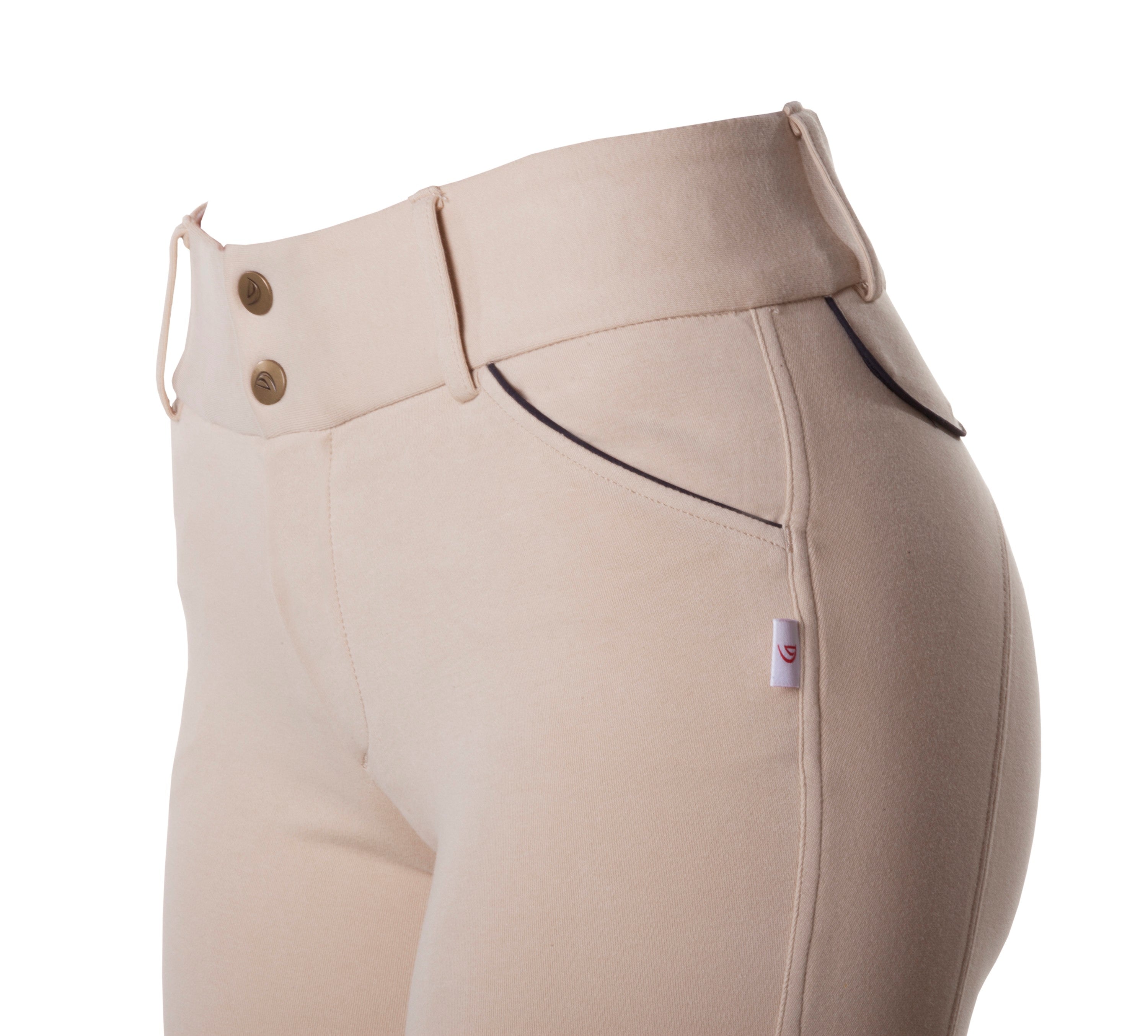 The Devon-Aire® Ladies’ Granada Mid-Rise Knee-Patch Breech is contoured through the legs and hips to provide a comfortable fit. Stylishly appointed with a Euro seat and piping on the two front pockets, it has a fashionably wide, plush elastic waistband.
