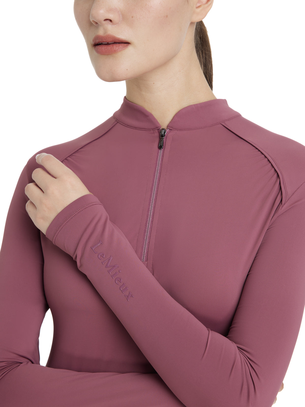 The LeMieux® Ladies’ Heyden Lightweight Base Layer raises the style stakes in this glam take on a performance base layer. Ultra-lightweight UV30+ cooling fabric with a technically advanced cooling treatment in the fabric to stay cool when the heat is on. Ruched raglan seams on the chest exudes style and mesh stripe on the arm and the side of the body allow for cooling airflow. Glossy hot fix branding on the back neck and subtle branding on arm. Elevated details like a pretty quarter zip with a chiseled puller, glossy hot fix branding on the back on the neck and subtle branding on the sleeve make this base layer both feminine and glamorous.
