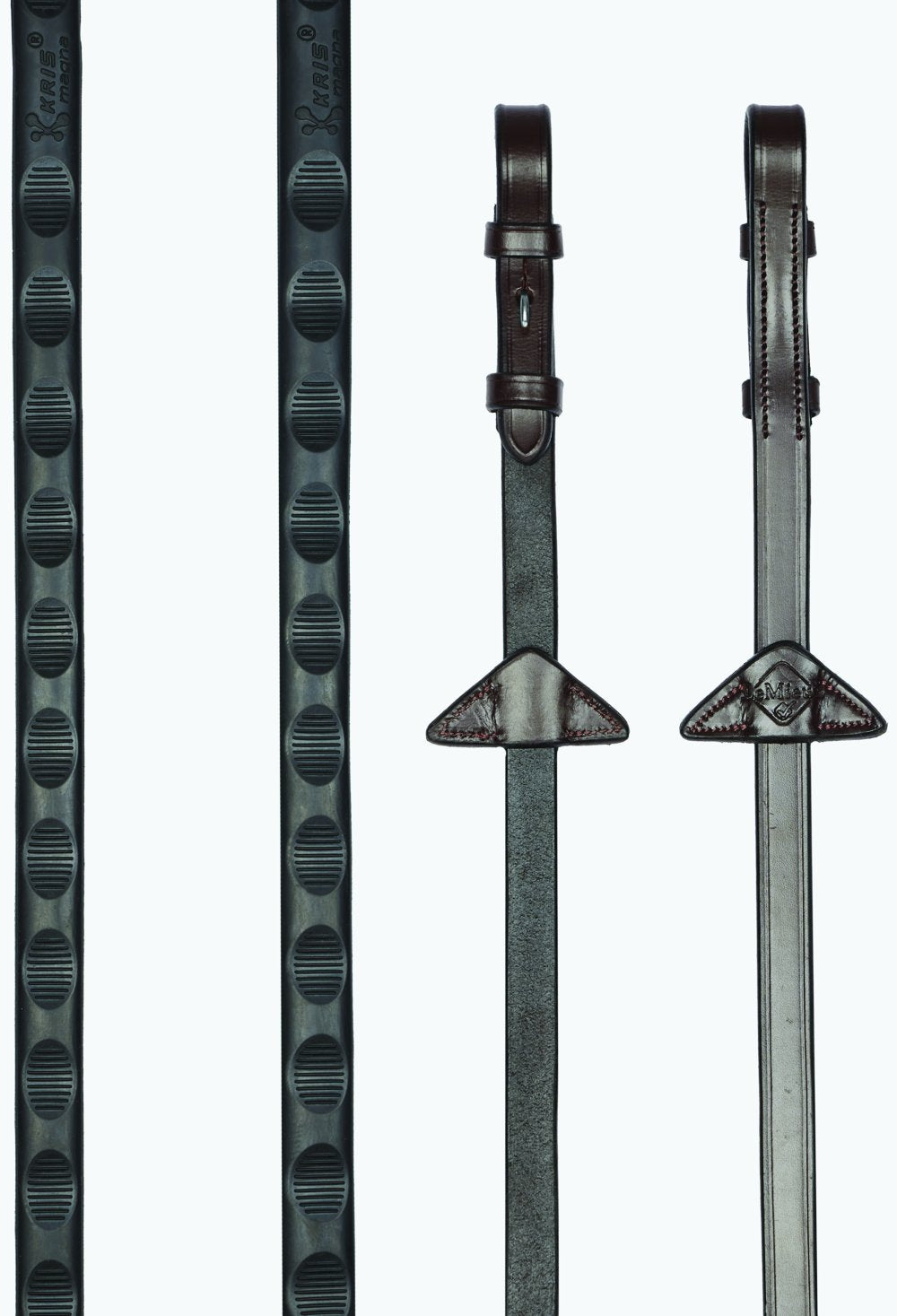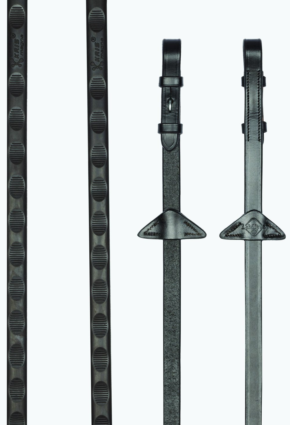 LeMieux® Magna Grip Rubber Reins are nylon-lined to prevent stretching and breaking and overlaid with rubber that has a rider’s thumb-shaped grip. Fitted with LeMieux branded leather martingale stops. Buckle bit ends.