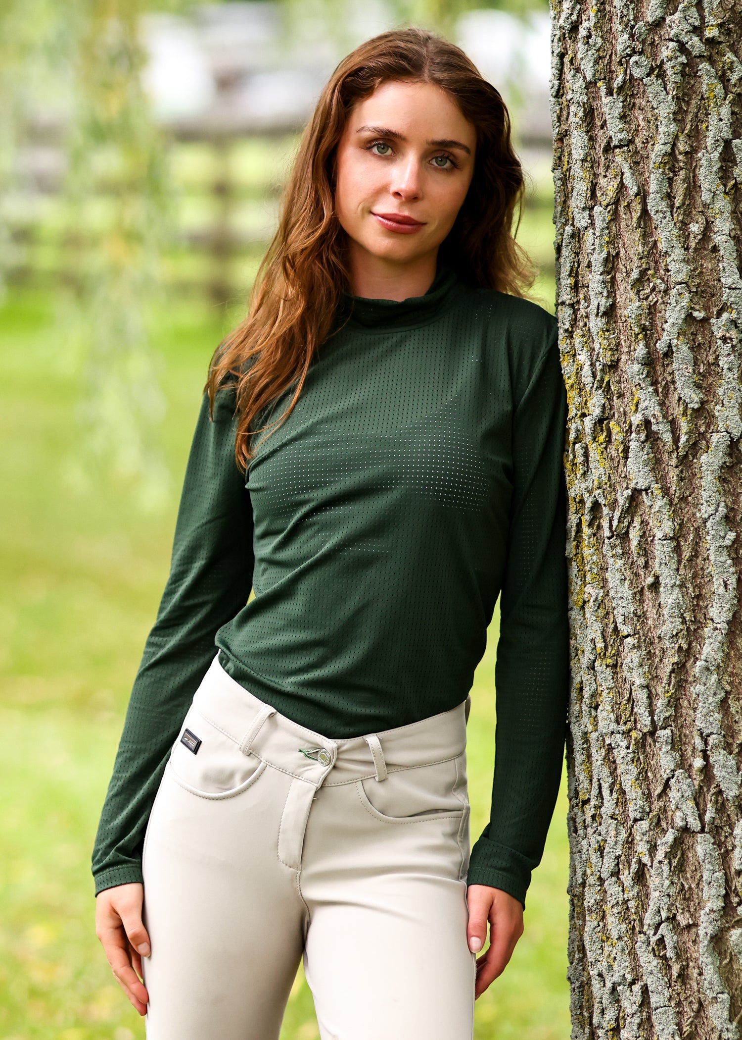 Equisite Alesia Long-Sleeve Shirt is a versatile high-collar technical top. The milky soft perforated fabric provides the breathability, mobility, coverage, and comfort needed during practice. The Alesia is form flattering, stylish and provides cooling airflow all day long.
