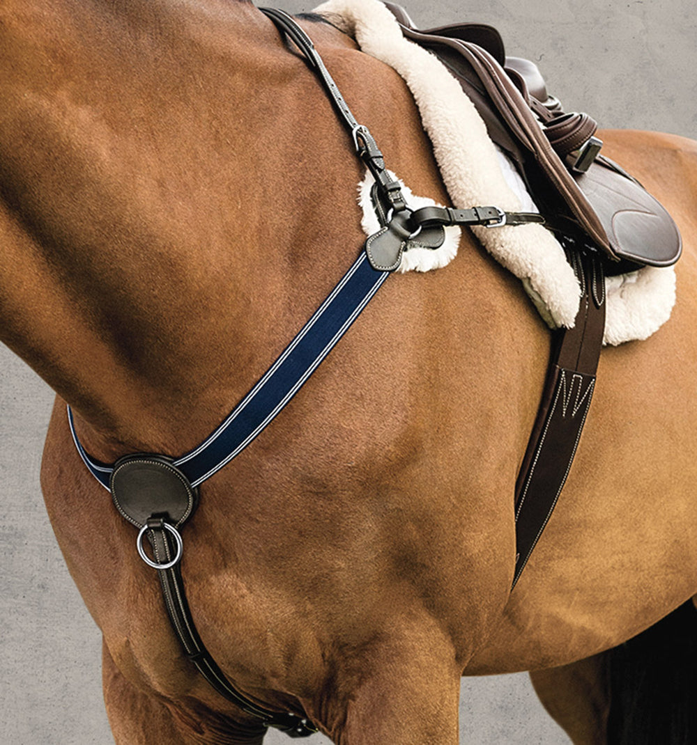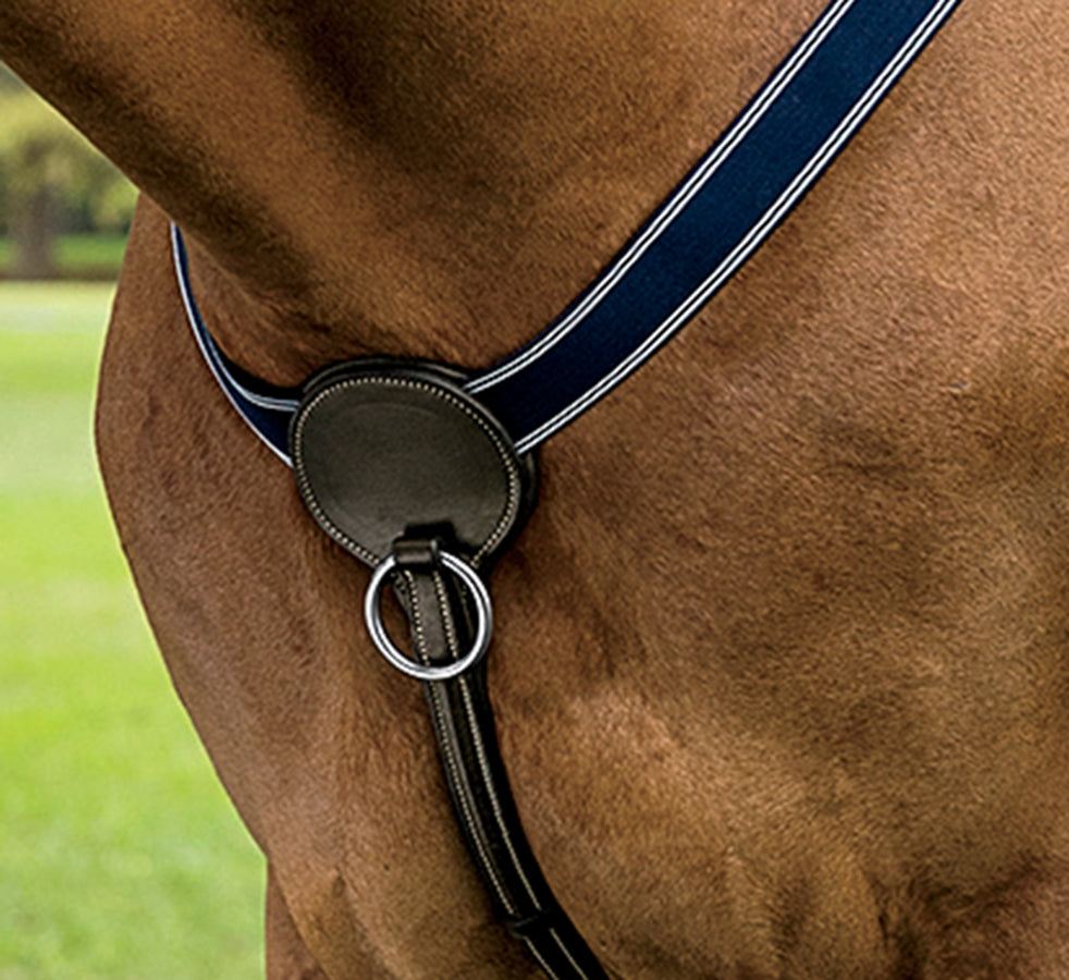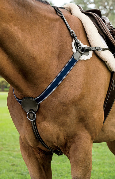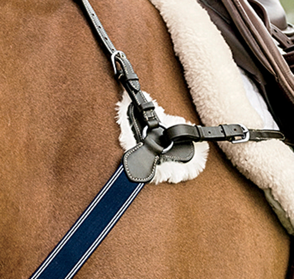 This DS Three-Point Breastplate delivers quality that defies its price. Raised, padded body and wither straps are accented with ivory stitching. Classic navy and white elastic shoulders combined with a large, soft leather yoke offer horse comfort and freedom of movement. Removable, washable sheepskin inserts help alleviate pressure across the shoulder. This beautiful but affordable breastplate is fully adjustable at the girth, shoulders and withers and includes an adjustable/removable running attachment. Stainless steel hardware throughout.