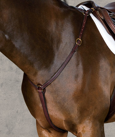 The choice of many top eventers, the Nunn Finer® Hunting Breastplate is made to withstand the rigors of the sport. It’s constructed of heavy 5/8" English bridle leather with durable brass hardware. Designed to stay in place, it has adjustments on both sides of the neck strap and attaches to your saddle dees with buckles.