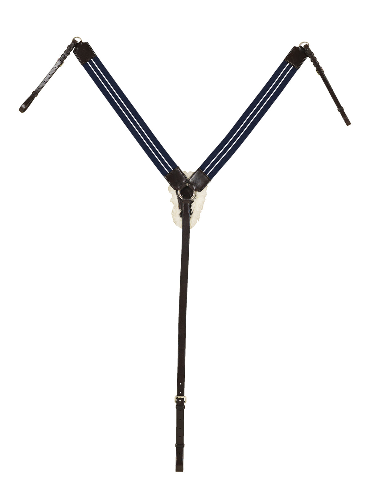 In classic navy and white elastic with dark brown leather, the Ovation® Elastic Breastplate has traditional style. It attaches to saddle dees only to allow for complete freedom of the wither area. It’s adjustable at the girth area and dee ring attachments. Sheepskin at the chest helps prevent rubs. Stainless steel hardware for long wear.
