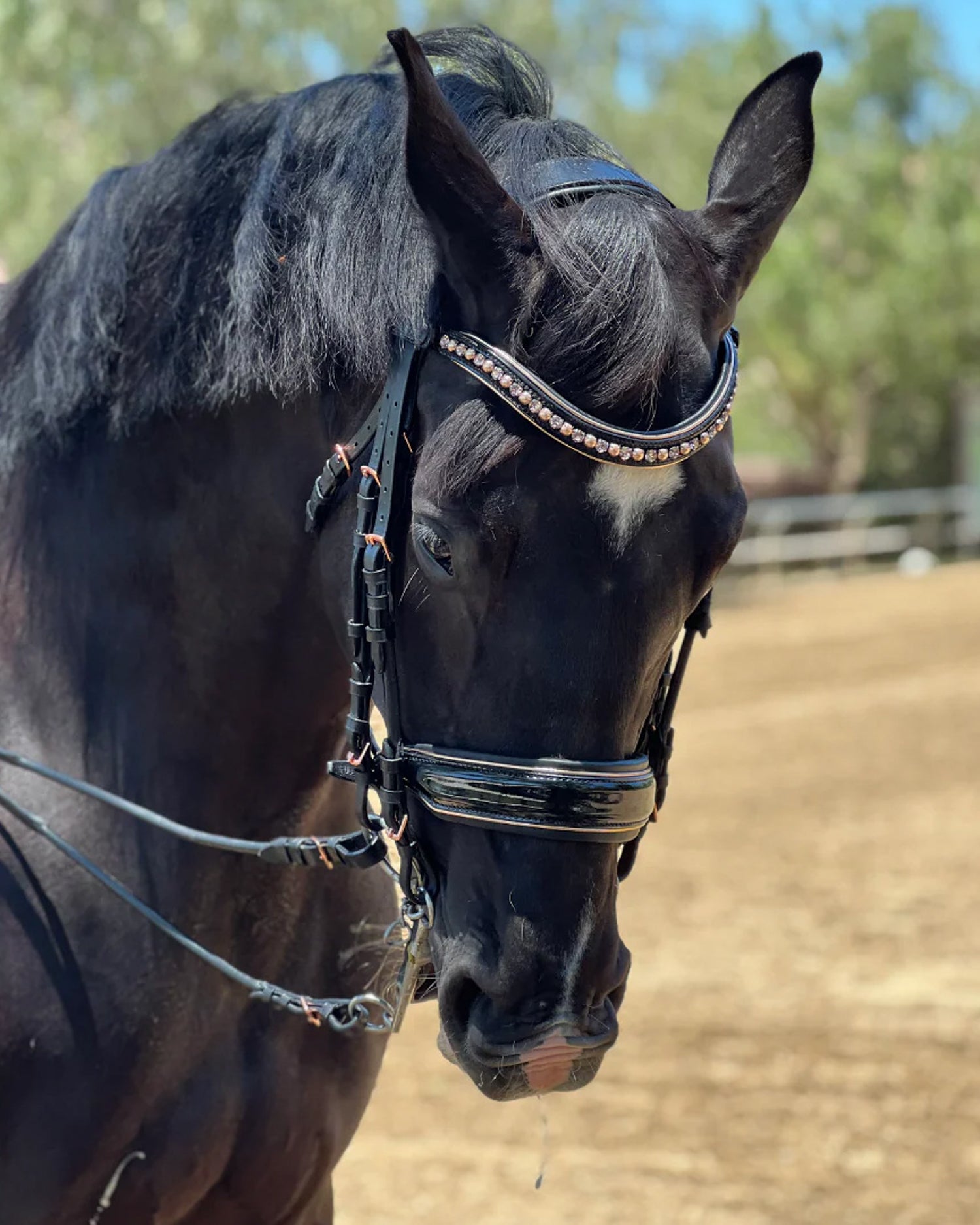 PRODUCT DESCRIPTION: Halter Ego Aurelia Rose Gold Black Patent Double Bridle