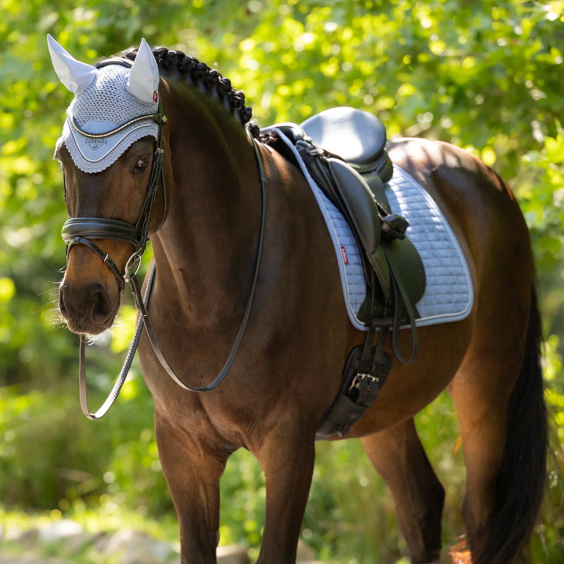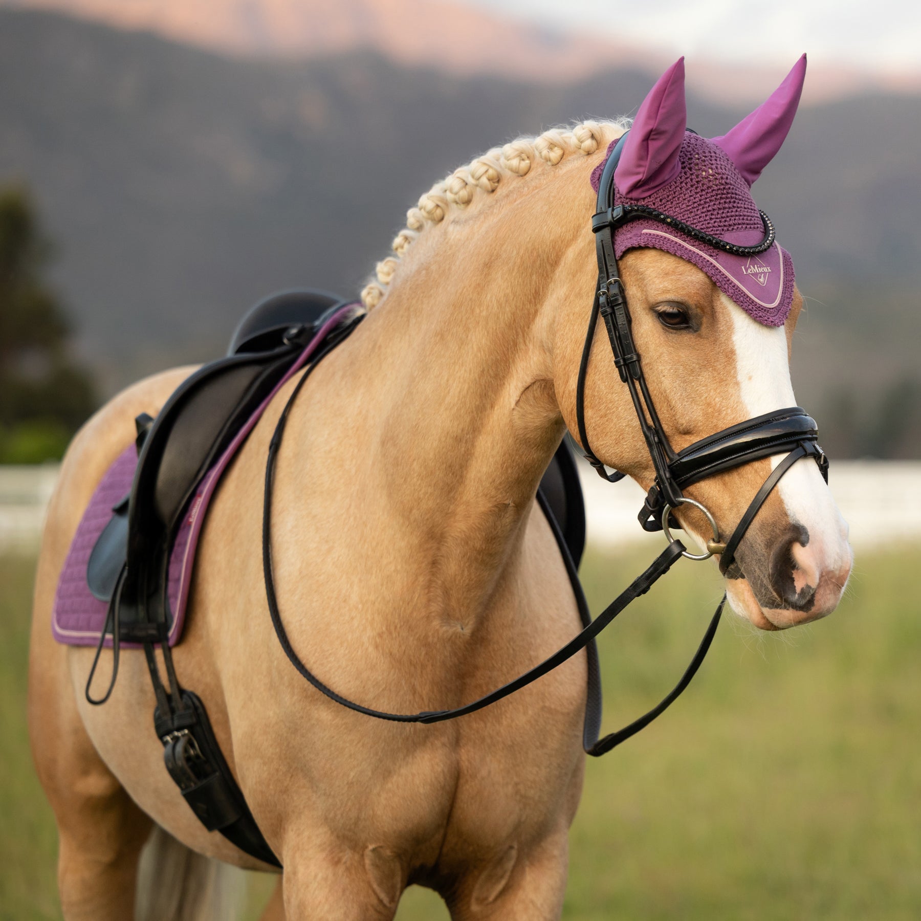 The LeMieux® Classic Fly Hood is a timeless and effective design that is comfortable for your horse to wear. The handmade, four-way stretch cotton face veil is edged with contrast trim, piping and a sueded front patch with logo. Soft, comfortable Lycra® ear covers stretch to allow natural ear movements while keeping insects out and distractions to a minimum. Secure and close-fitting under a bridle, this fly bonnet pleases even the most serious riders.