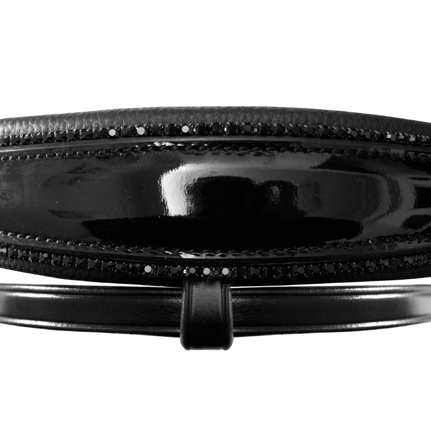 Anatomically shaped, the Passier® Shadow Bridle is a horse-friendly design. Big premium crystals in graphite outline the browband adding the perfect amount of bling. The waved and rimless design of the browband enhances its glamorous appearance. Softly padded noseband in elegant patent leather with small premium crystals in graphite that line the padding. Soft padding near the horses sensitive ear cartilage provides extra comfort. Crank noseband. Flash noseband with removable strap. Stainless steel fittings. Hook stud closures. Flat cheekpieces. Soft leather comfort reins with leather hand grips, rein stops and stainless steel, including hook stud closures, are included.