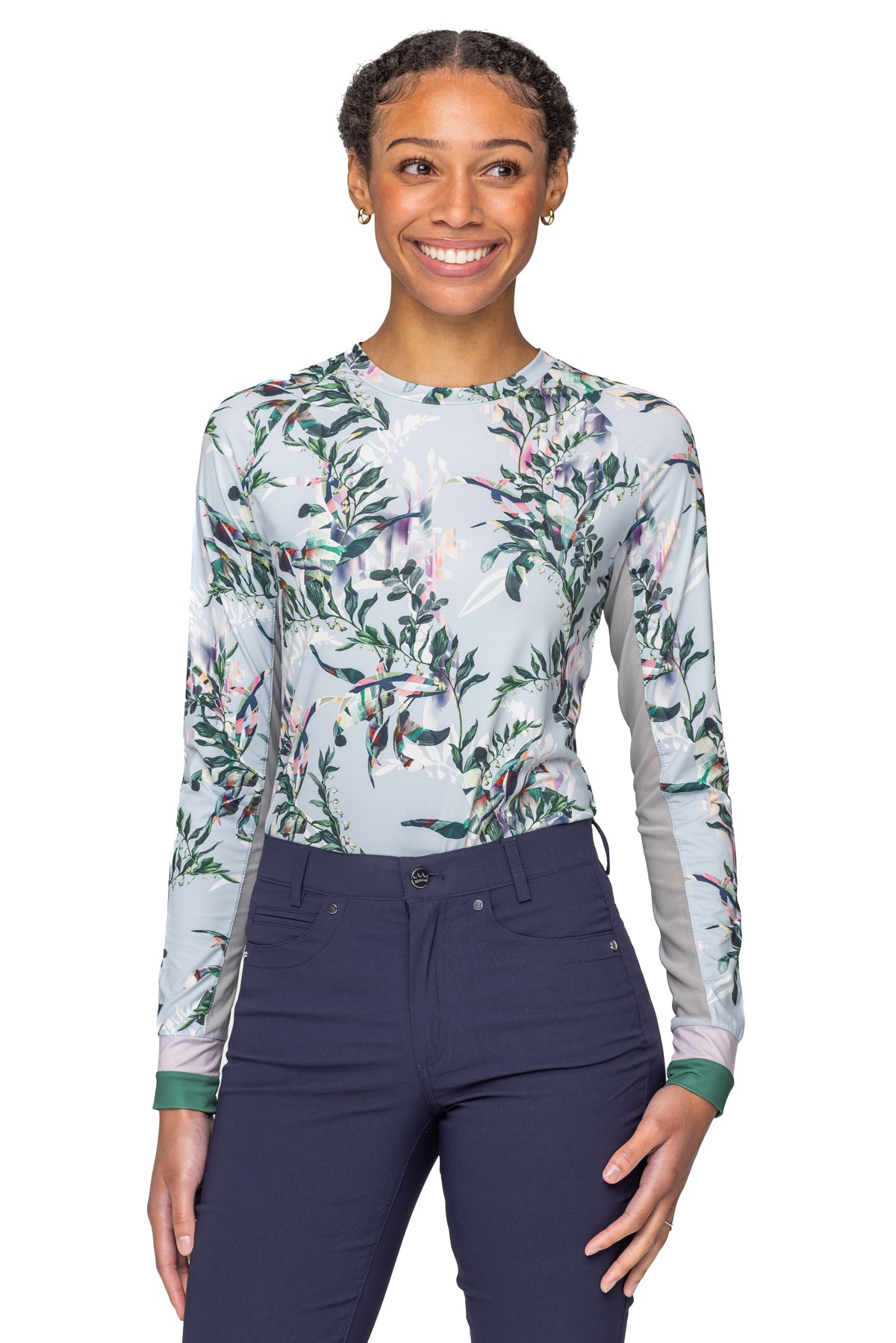 The Kastel Crewneck Long Sleeve Shirt "Kaya" in an elevated crewneck. Beautiful powder blue and greens in Kastel's botanical print will make this shirt a favorite. Sporty stripe trim at the cuffs, breathable power mesh, UPF 30 and soft 4-way stretch fabric in a contemporary fit.
