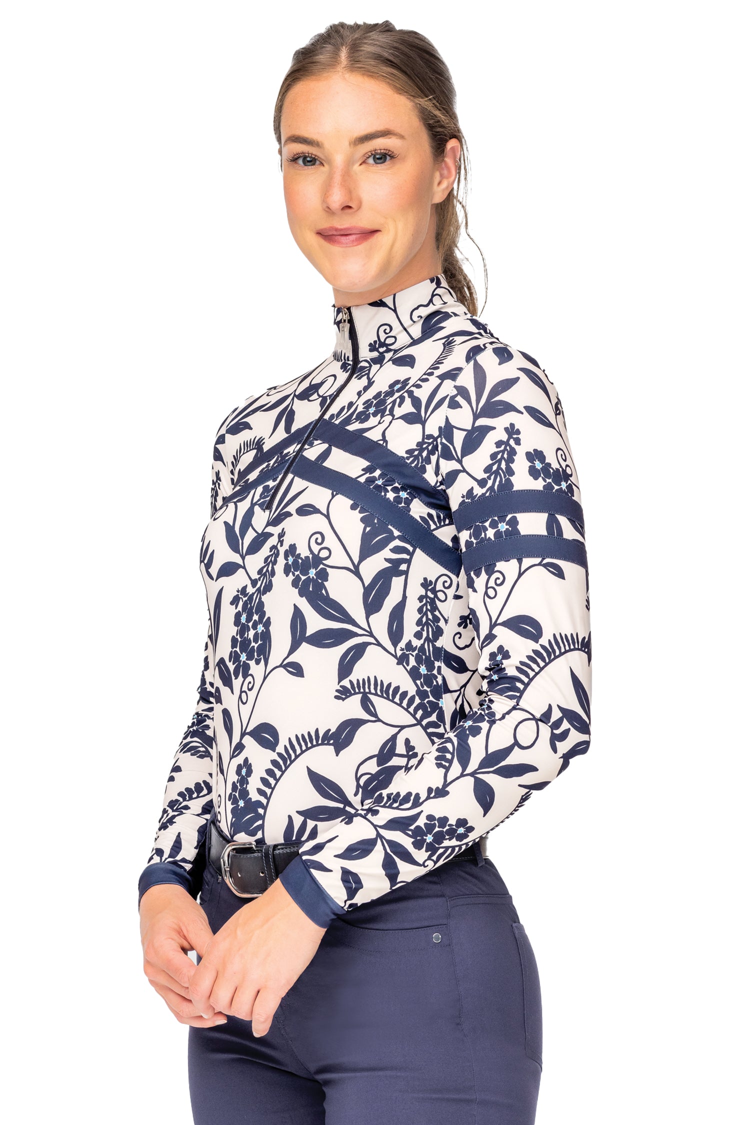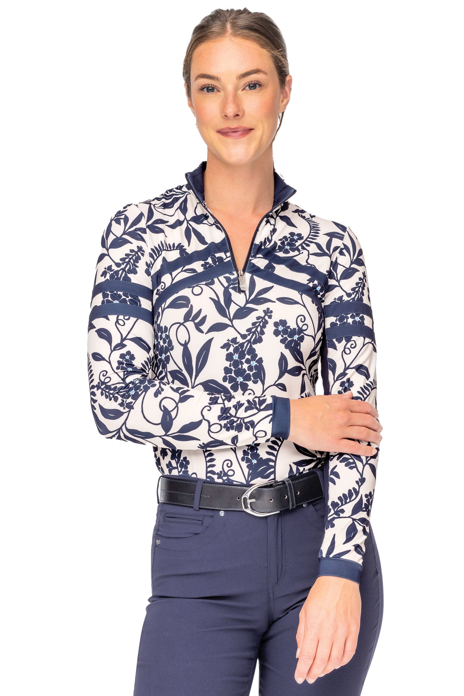 This season's feminine Kastel Denmark quarter-zip top is versatile and fashionable. Climbing vine print in rich navy and gardenia sports navy chevron stripes for a unique look. UPF 30 sun protection, 1/4 zip neckline, breathable power mesh, soft 4-way stretch, flattering worn tucked in or left out for a contemporary look.