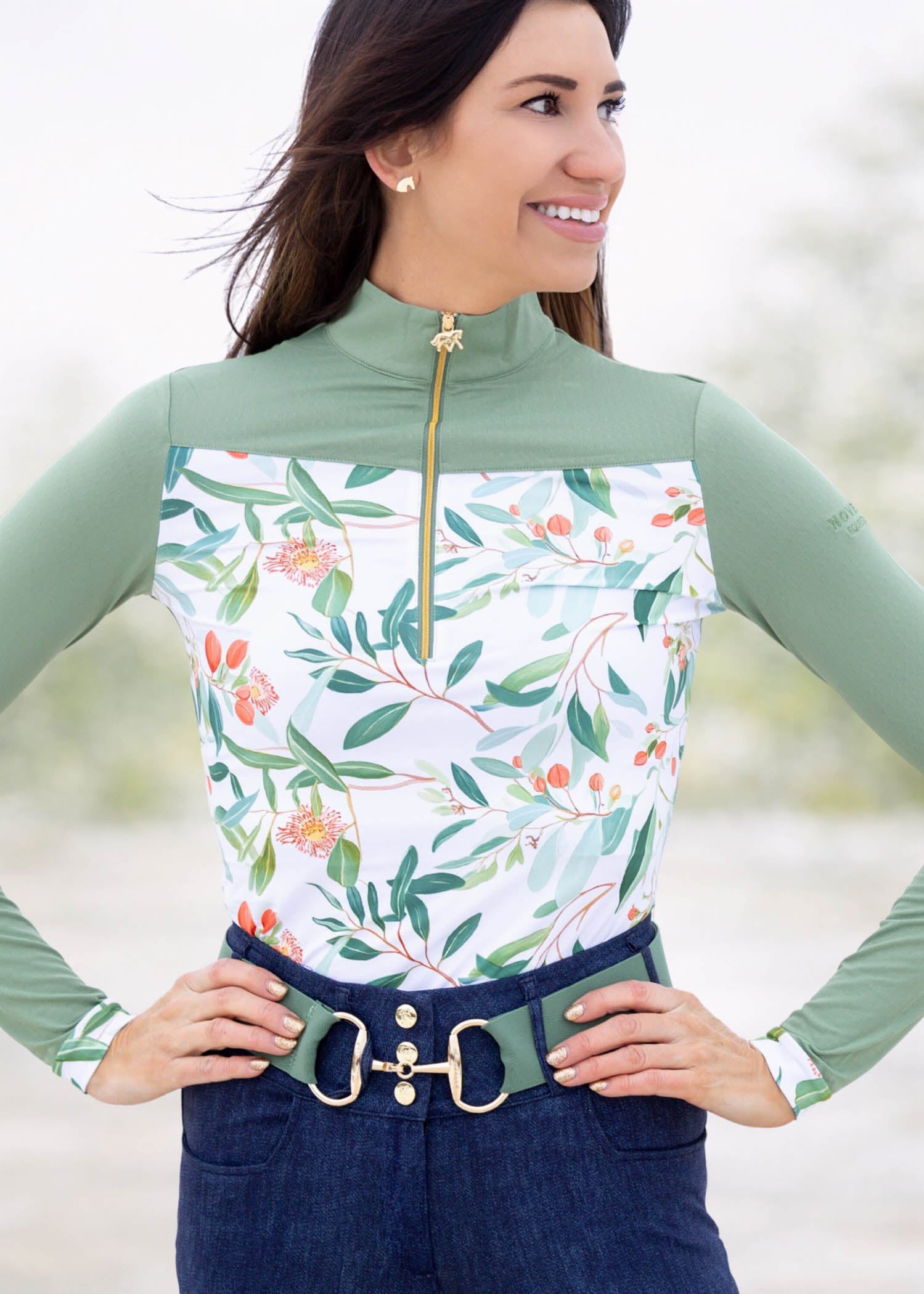 Pairing a fresh spring sage base highlighted with punchy peach florals, the Novella® Equestrian The Peaches Long-Sleeve Sunshirt is ready for spring. Evoking the feeling of trees in bloom and sunny rides, the whimsical floral detailing is guaranteed to bring in compliments wherever you go. Perfect for springtime rides, this piece balances elegance with playful charm.