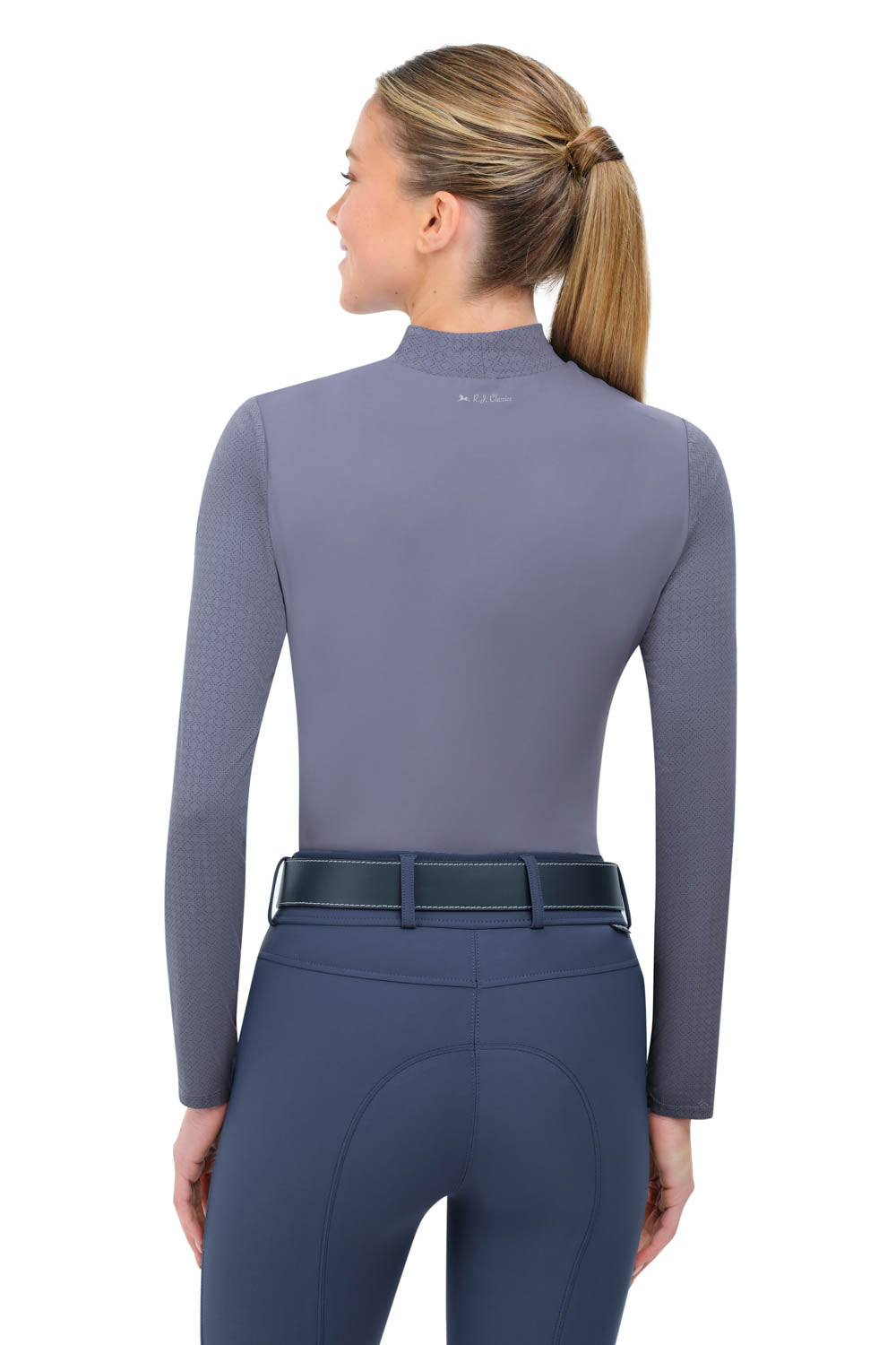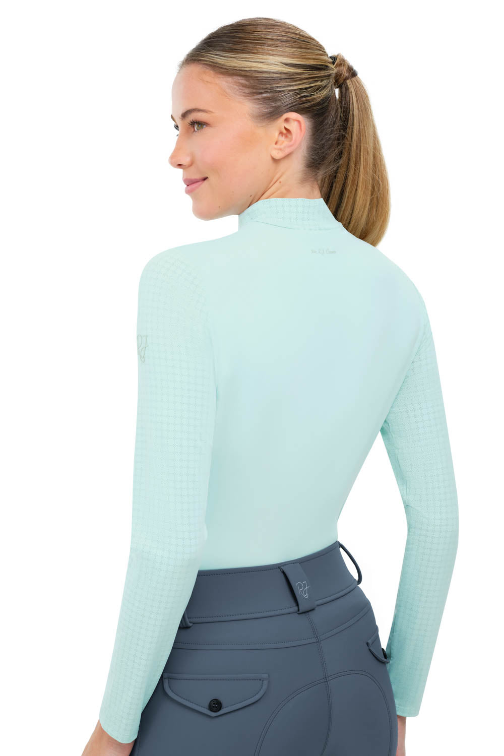 A sleek, flattering silhouette with an elevated mock neck for a sophisticated look under your show coat. The perfect choice for on-trend styling this season, it features a silky, cooling fabric designed to move with you for unrestricted comfort in the saddle. New unique micro perforated design on sleeves and collar adds essential ventilation.