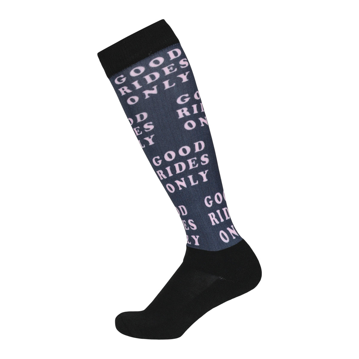 Introducing the new Dapplebay Slick Boot Socks! This adorable pair features a fun equestrian design in silky smooth nylon–perfect for under tall boots! Slick calf for comfort with a no-show black cuff that ensures a professional look under riding boots. Cushioned ankle and sole provides all day comfort.
