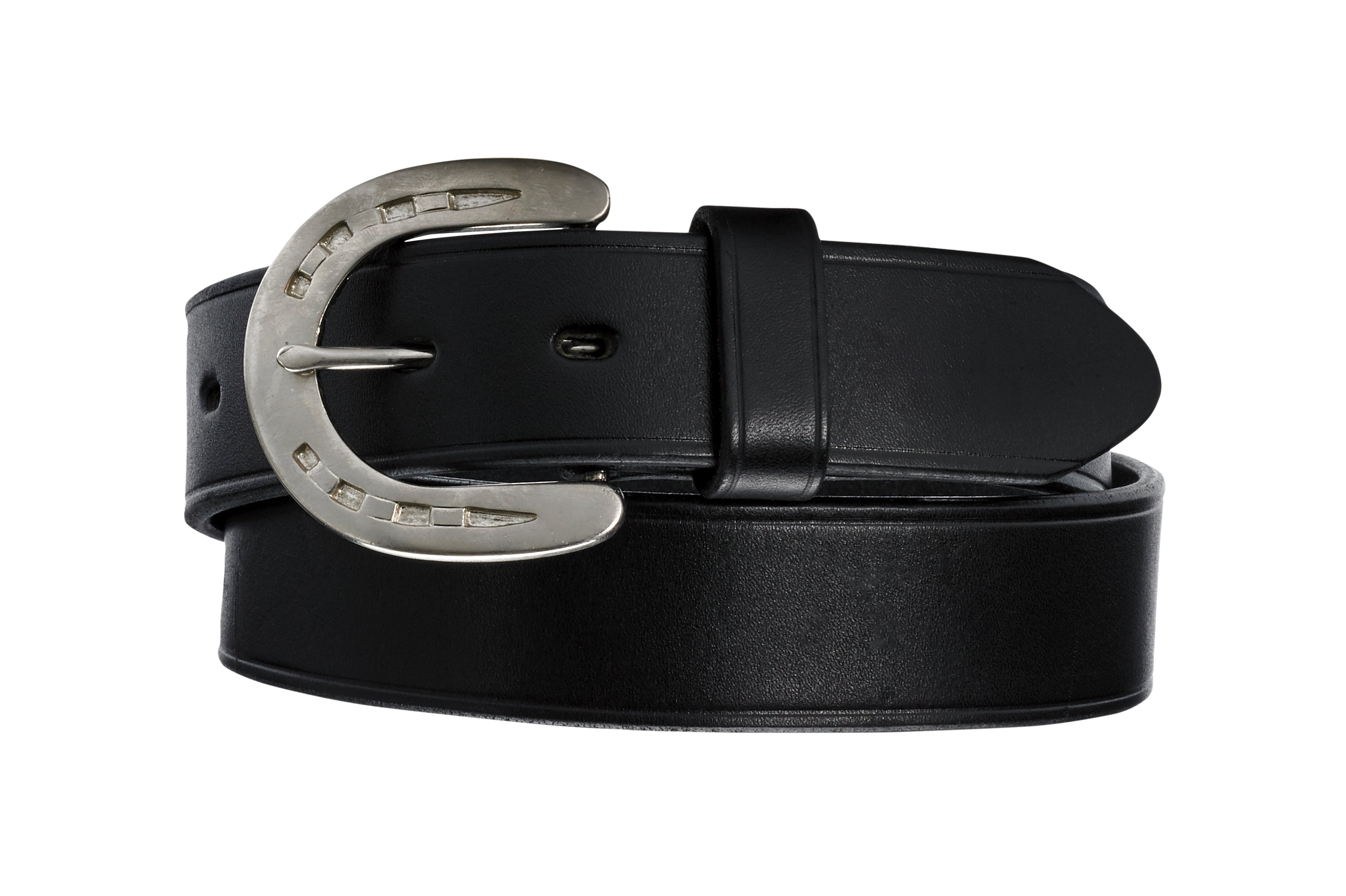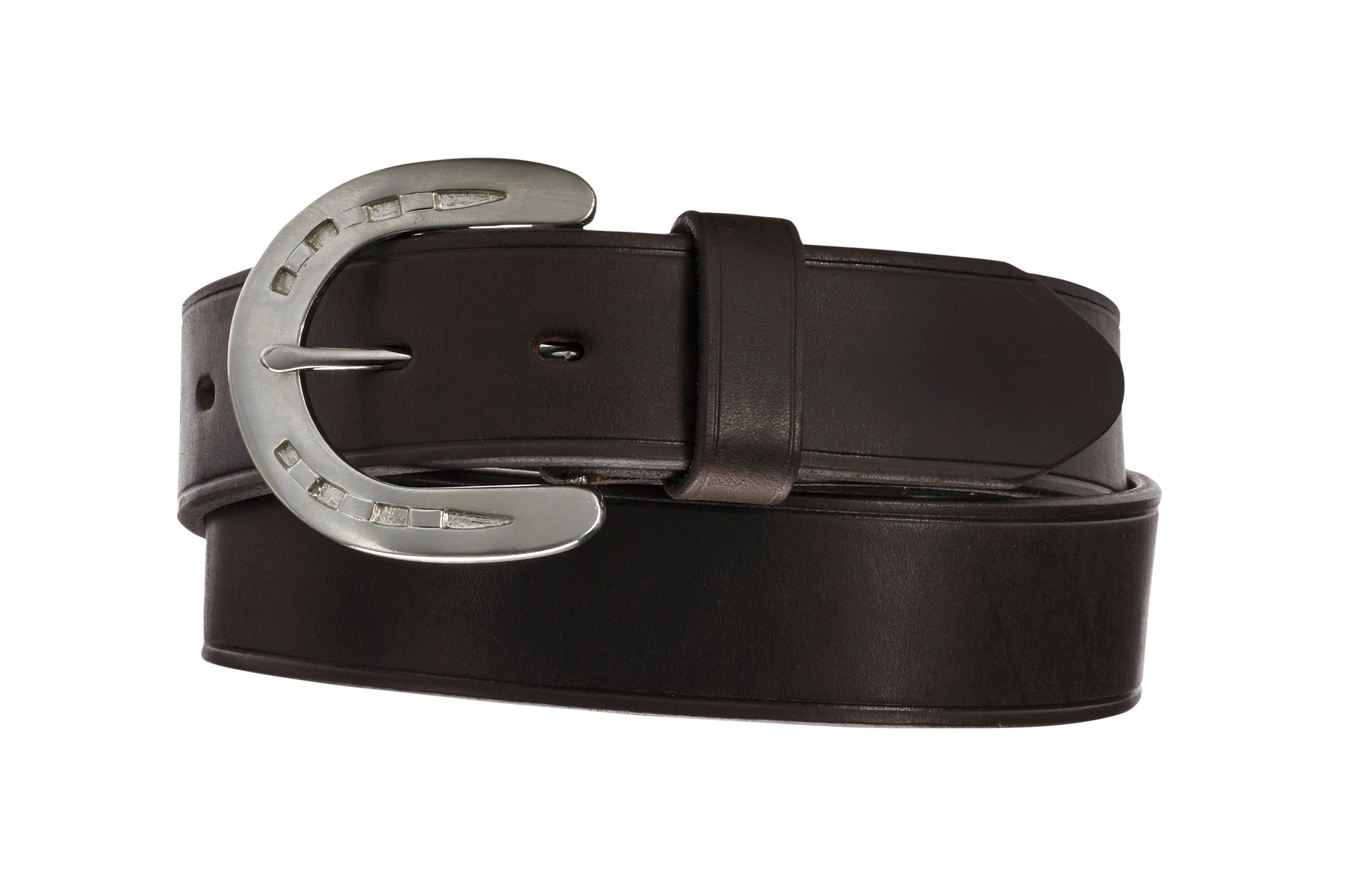 Invite extra luck and equestrian flair into your look! This Horseshoe Good Luck Belt is crafted from a strap of leather and fitted with a nickel buckle in the shape of a horseshoe. 1 1/4" wide with seven adjustment holes.