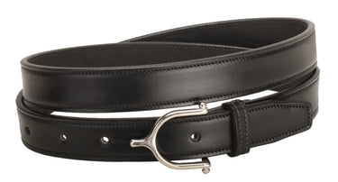 The Tory Leather 1" Stitched Belt with Stainless Steel Spur Buckle is a plain strap style made of bridle leather with stitched edges. A non-removable English spur-shaped buckle has a sewn closure.