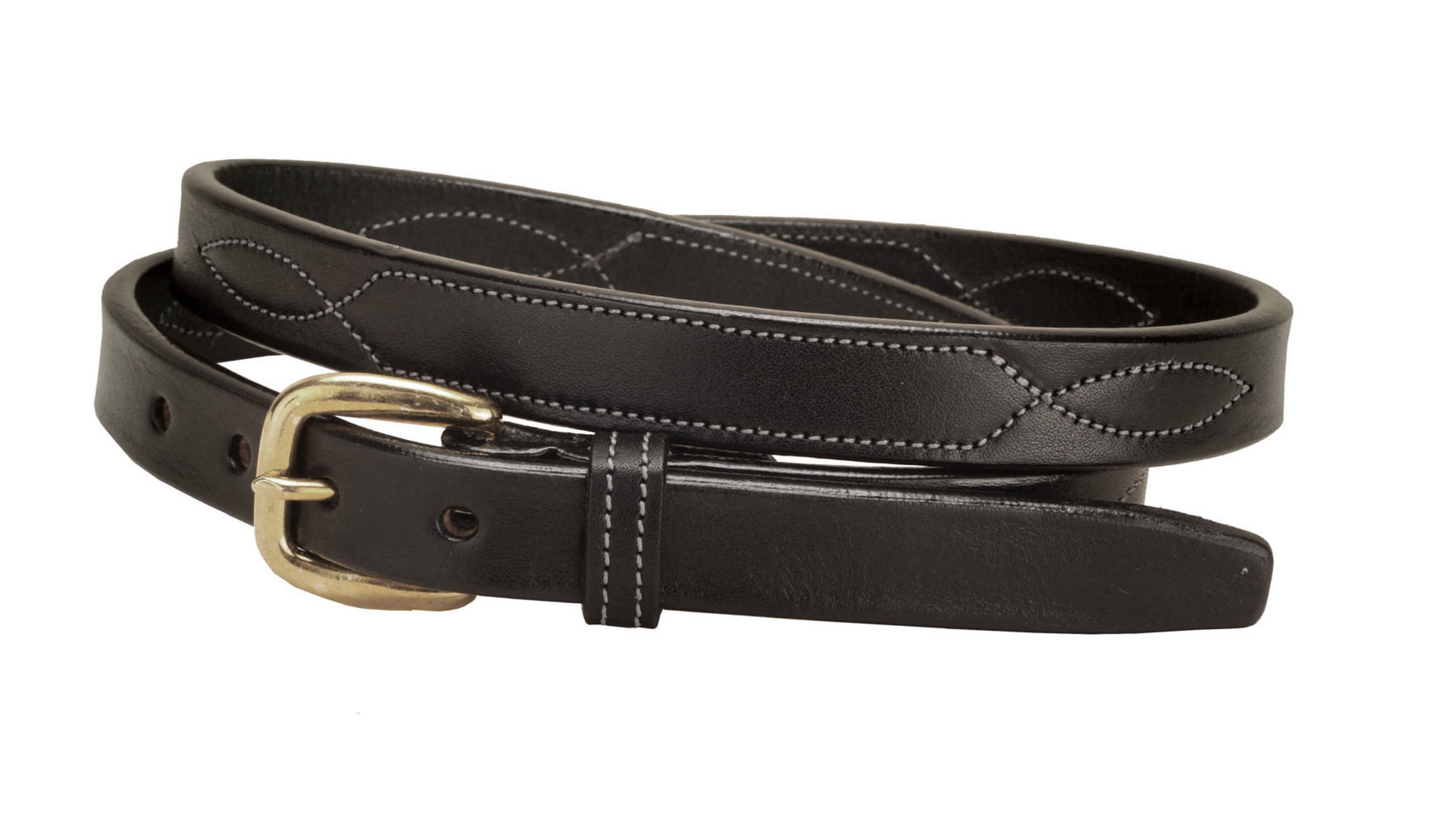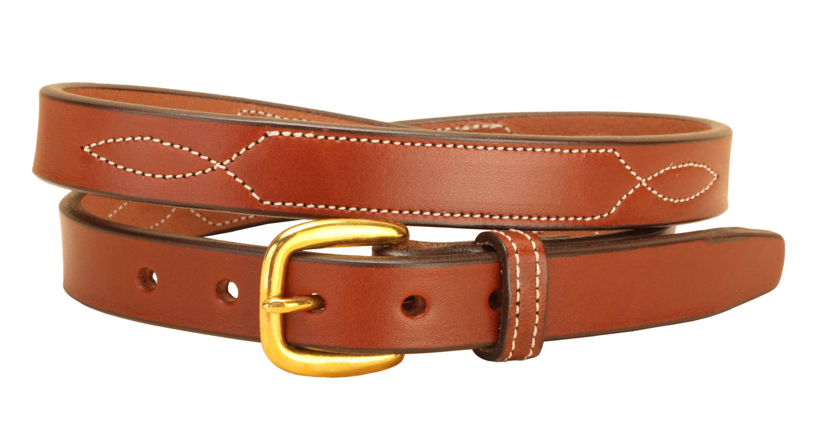 Display the names of your favorite horses or pets each time you wear this Tory Leather 3/4" Belt with Stitched Patterns & Brass Buckle. Made in the USA from high-quality bridle leather, this belt has space for up to three of your own nameplates, with each spot accented by fancy stitching. Looks perfect with breeches or jeans! Sewn buckle closure.