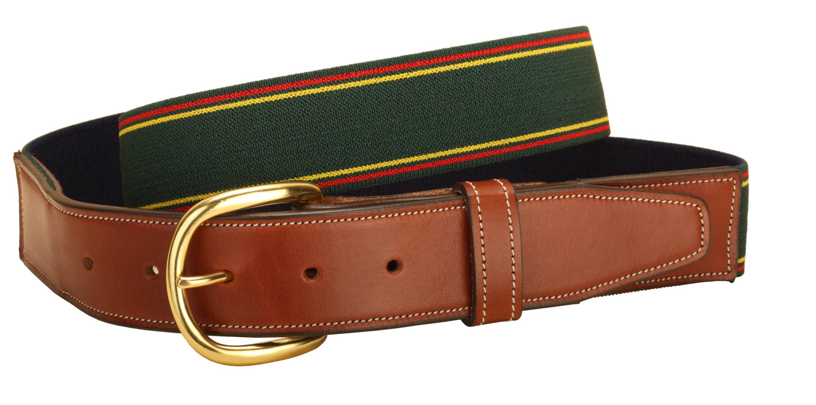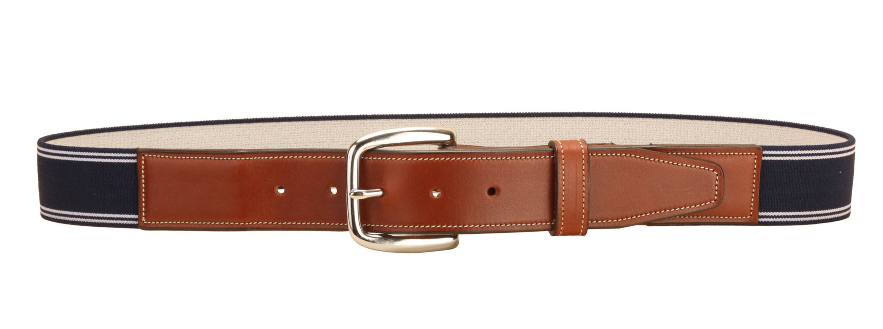 A sporty look for any outfit. This Tory Leather Striped Elastic and Leather Belt is a beautifully crafted design highlighted by a durable striped elastic strap finished with luxuriously supple leather billets and a D-ring brass buckle. 1.5" wide. Proudly made in the USA by an American classic in equestrian leather tack, Tory Leather uses only environmentally friendly leather tanned in vegetable extracts for rich, long-lasting color.