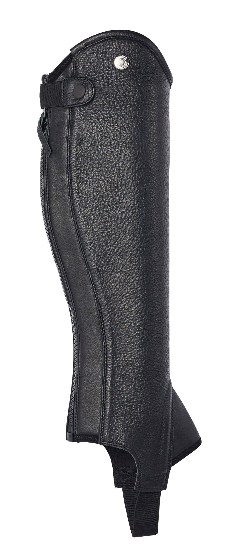 Lined in breathable and stretchy cotton fabric, it boasts a reinforced zipper that closes from bottom to top and secures with a snap keeper. Interior Equestrian Grip Strip™ is a horizontal stripe of silicone grip that prevents the half chap from twisting and sliding. Finished with a wide under-foot elastic strap.