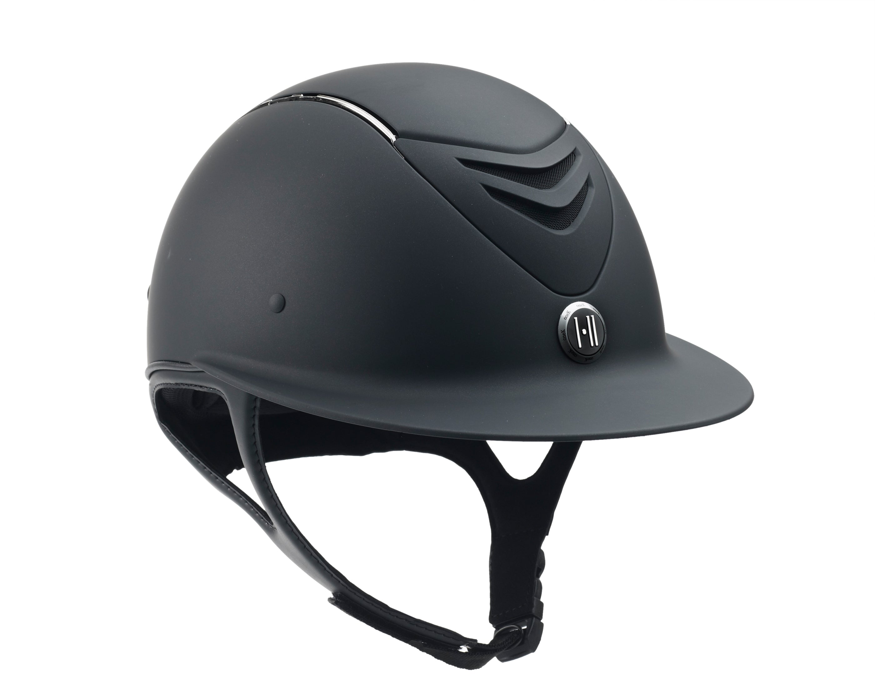 The One K™ Defender AVANCE Wide Brim Chrome Stripe Riding Helmet** combines all of the features of the original One K Defender with the addition of a wide brim to offer additional coverage from the sun’s damaging rays. Two side, two front, one back and two center stripe vents for airflow are covered in stainless steel mesh. The comfort padded harness has a synthetic suede lining, hook-and-loop adjustment and Fastex buckle.