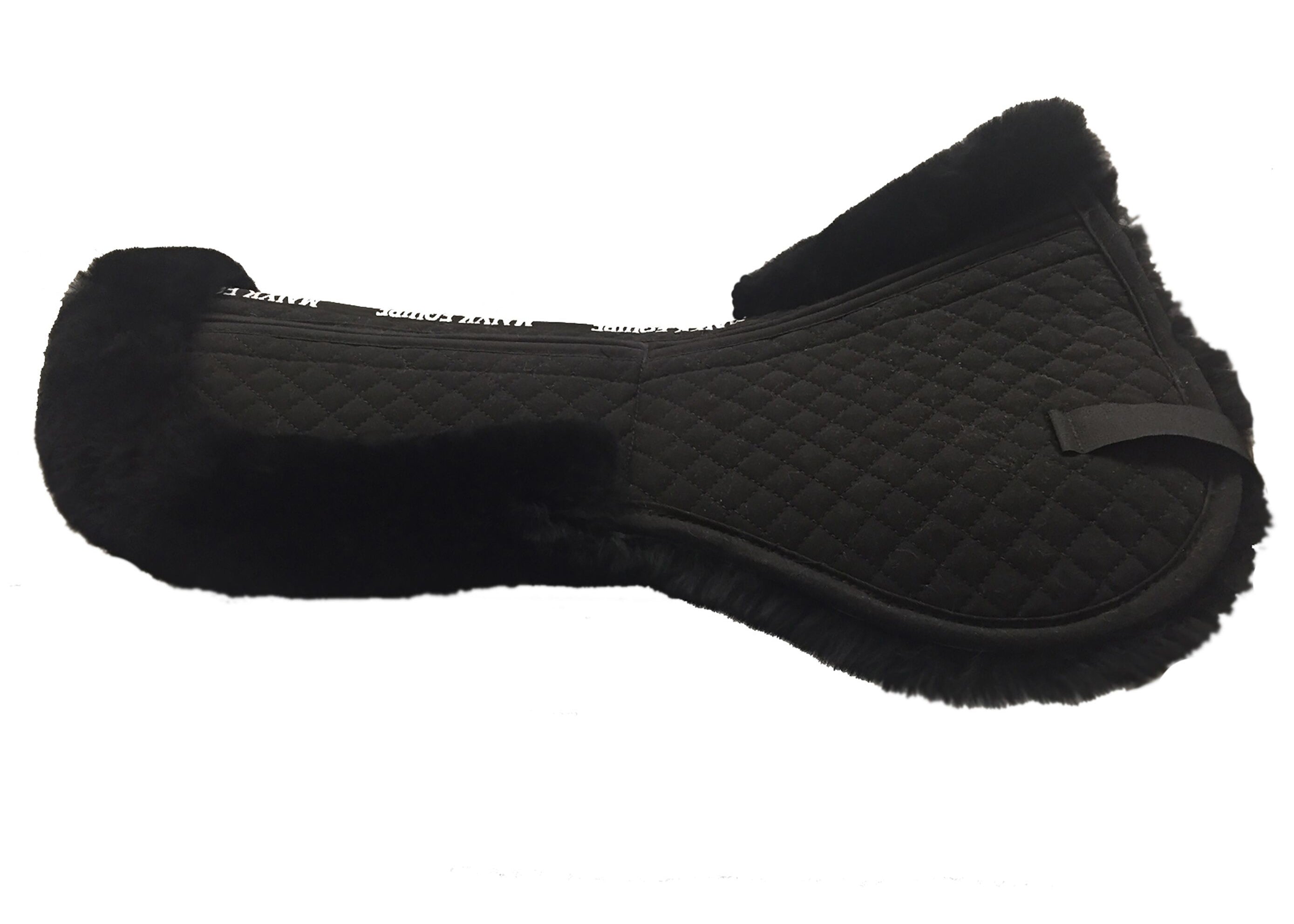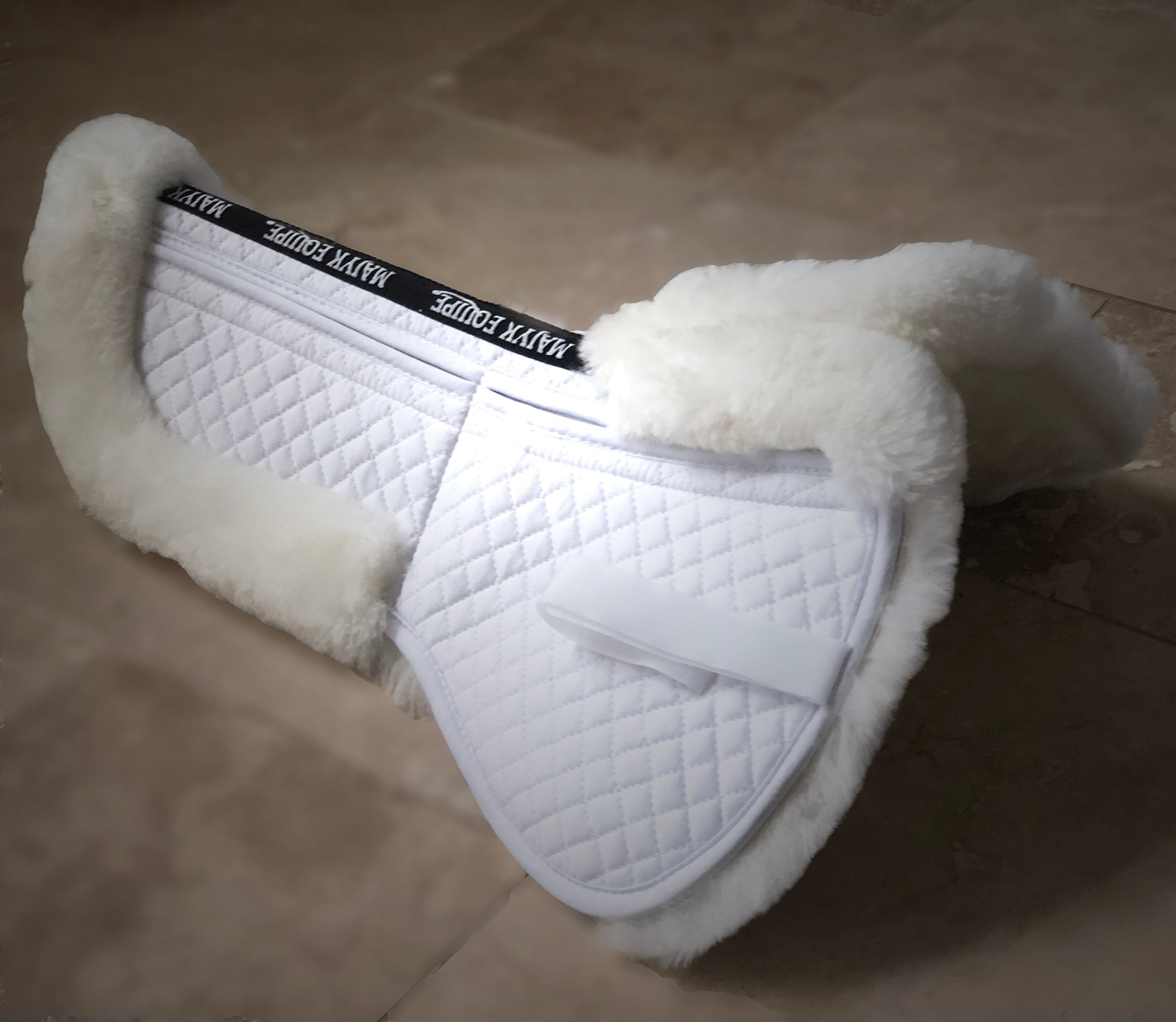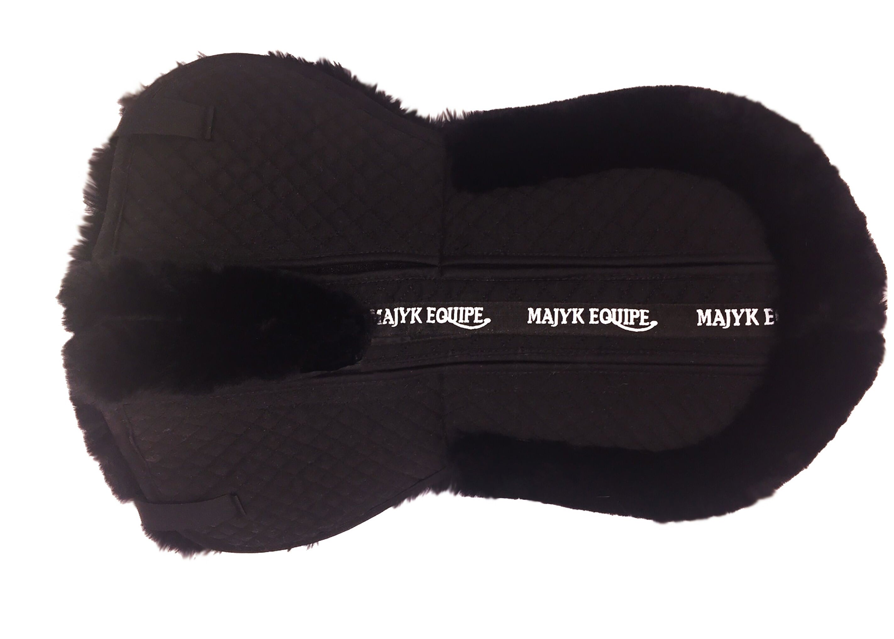 Customizable shims provide the ultimate combination of comfort and technology. Constructed from a high-loft, dense 1 1/4" long 100% Australian fleece with lightweight fabric, the Majyk Equipe half pad combines natural cushioning and moisture wicking qualities of sheepskin with ultimate impact protection. The pad features unique Split Wither Relief technology to relieve pressure across the withers and Spine Relief along the underside of the pad.