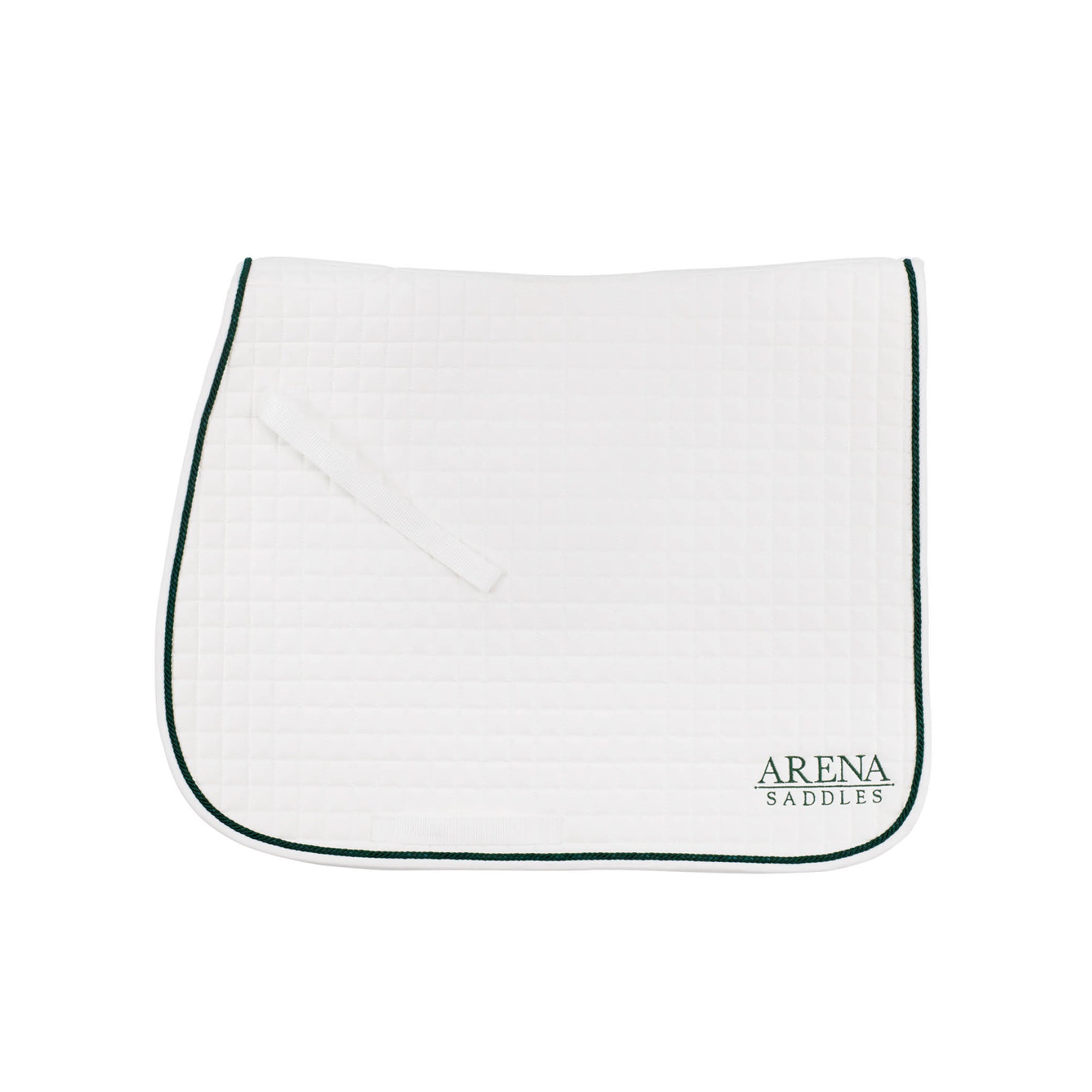 The Arena Dressage Pad pairs perfectly with your Arena Dressage Saddle. This smart and soft quilted cotton saddle cloth is trimmed with classic green rope trim. Billet straps add security.