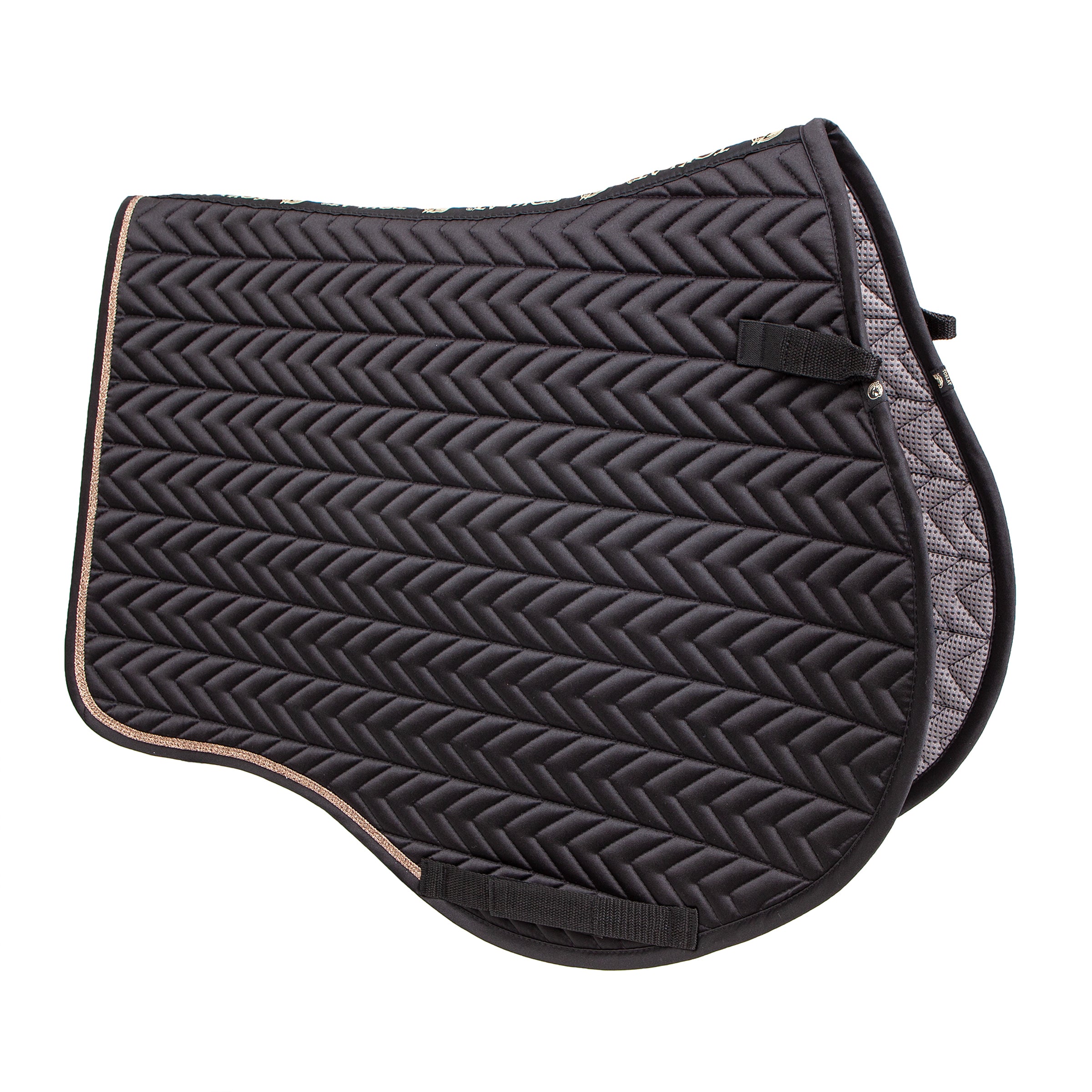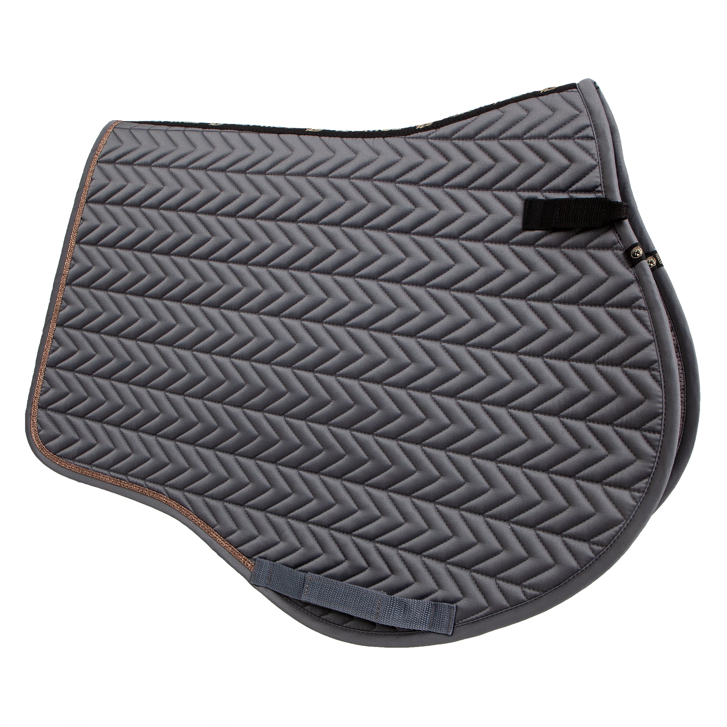 Shaped to fit jump saddles, the Toklat® Tango Chevron Close Contact Pad features a luxurious satin top, a classic chevron quilt pattern and shimmering metallic gold trim. It is lined with soft, eco-friendly bamboo fabric that is naturally antibacterial, antifungal and moisture-wicking.