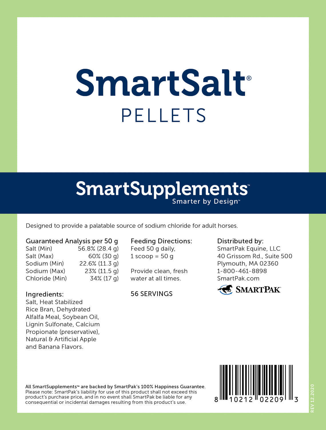 SmartEquine™ SmartSalt Pellets provide a palatable source of salt (sodium chloride) to help your horse stay healthy and hydrated. These apple-banana flavored pellets provide one ounce of sodium chloride per serving and are perfect for picky eaters! SmartSalt Pellets are ideal for all horses, to help meet their daily sodium requirement.