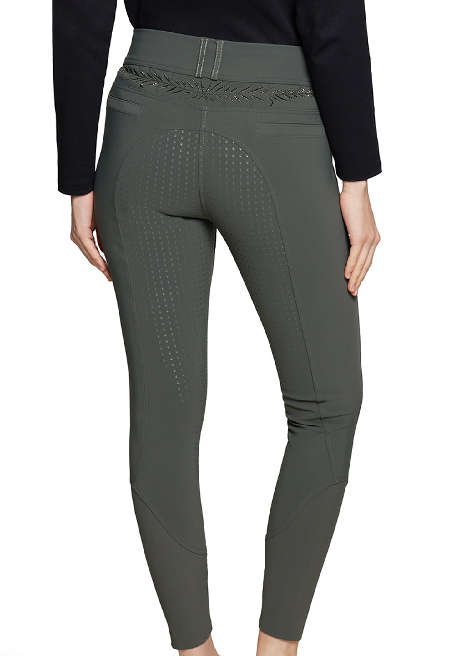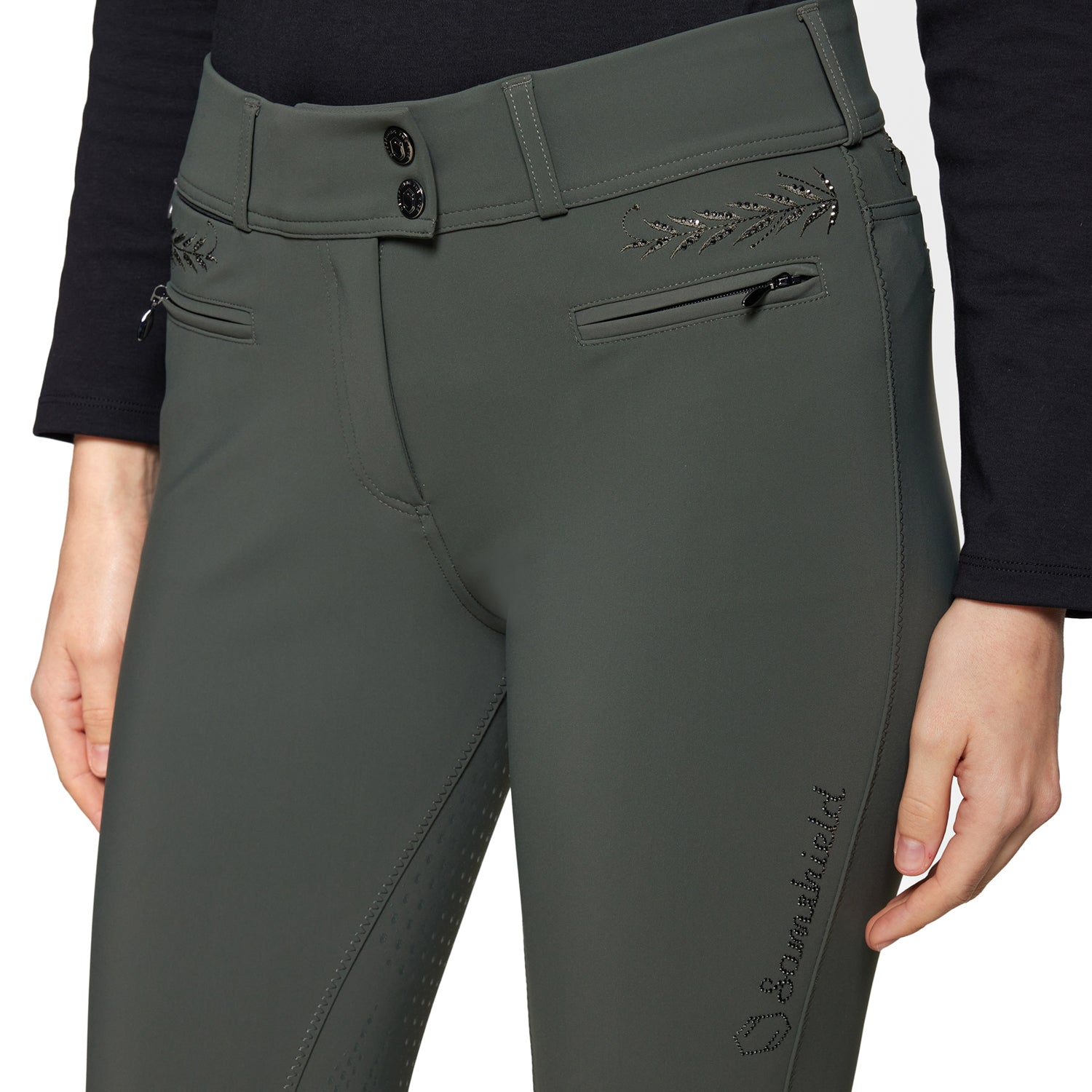 The Samshield® Ladies’ Capucine Full-Seat Breech provides minimalist equestrian styling with Swarovski® crystal detailing. High-rise with floral designs and Swarovski crystals on the back, thigh and above the two front zip pockets, these breeches combine elegance and performance for all disciplines. Breathable and stretchy fabric is designed in an eco-responsible way to last over time with anti-pilling, wrinkle-resistant finish. Two zip pockets on front, invisible zip pone pocket and two pockets on the back. Compressive material on the calves for better blood circulation. UPF 50 protection.